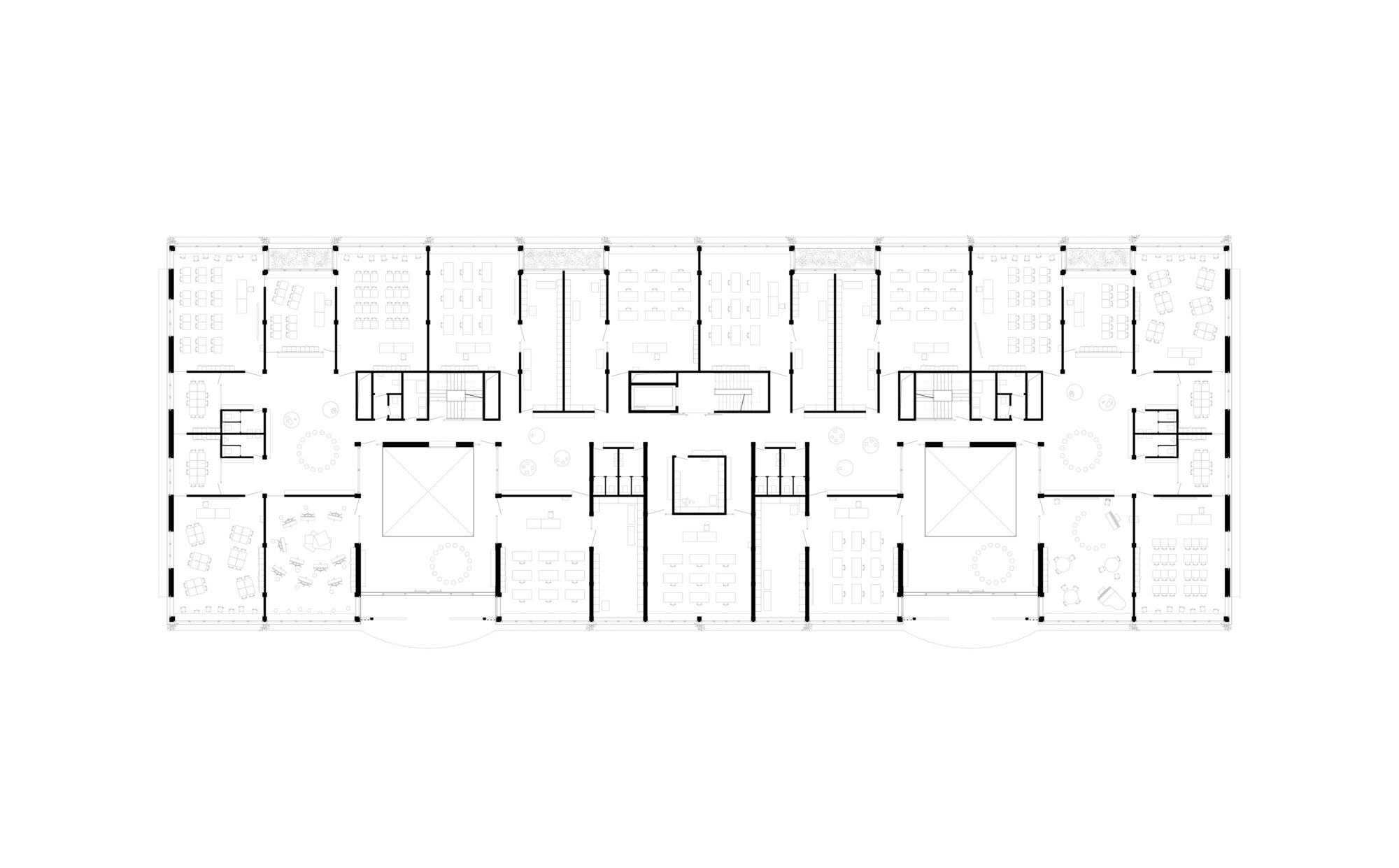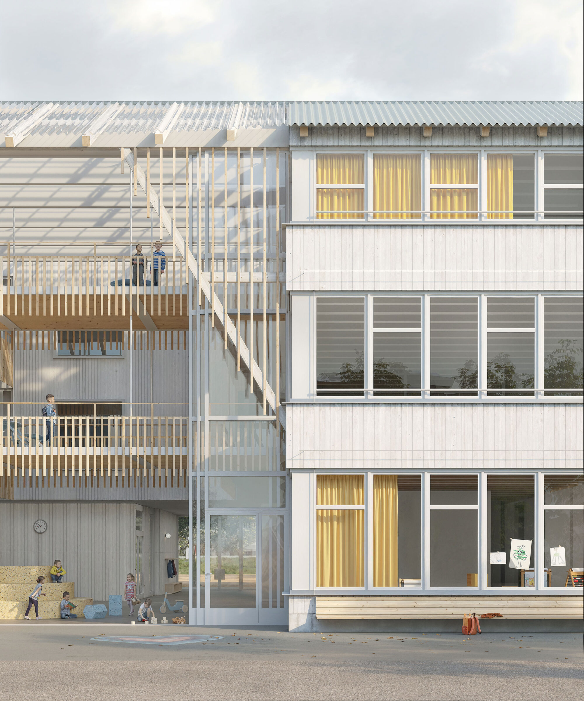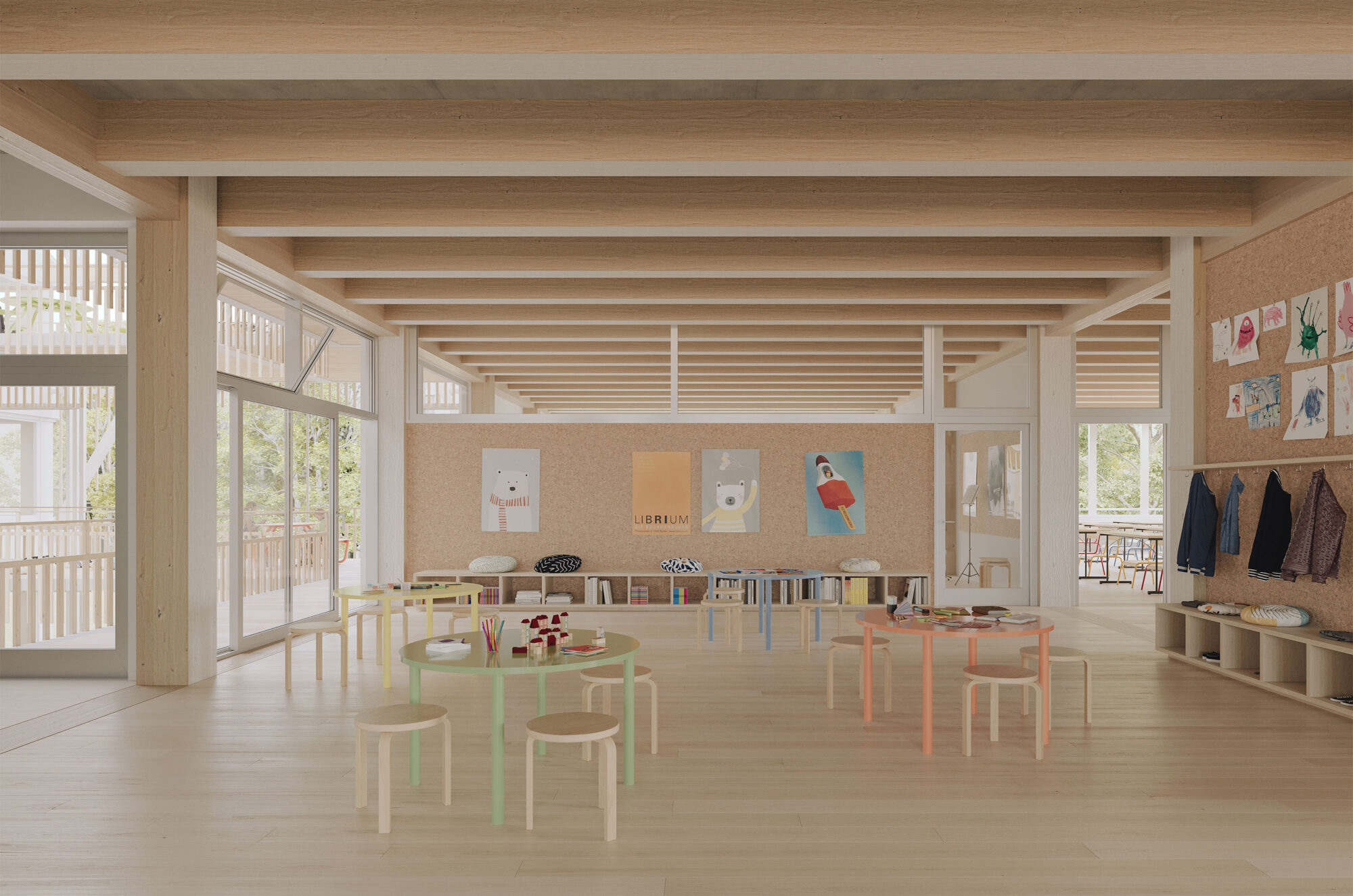 The school is conceived as an open timber structure with two large inner courtyards functioning as climatic buffer zones. These light-filled spaces remain open in summer and can be enclosed in winter, serving as flexible foyers, outdoor classrooms and meeting areas. Public functions such as the assembly hall, library, cafeteria and day-care facilities are located on the ground floor, while the upper levels are organised into educational clusters. The clusters are designed in a residential-like manner, with central learning zones, open visual connections and quiet retreat spaces. Flexible spatial structures allow for future adaptations and different pedagogical concepts.