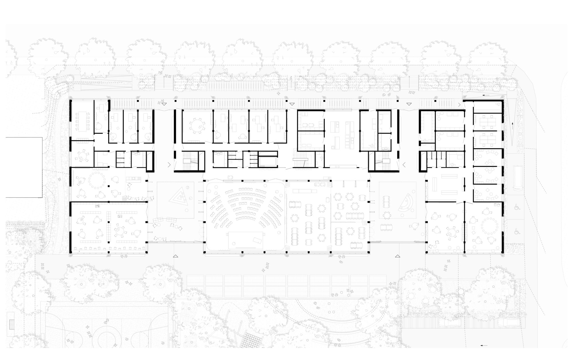 The new school building is positioned as a street-defining public structure and forms a counterpart to the existing clinic with its park landscape. Its compact placement creates a generous, noise-protected open space to the south, serving both the school and the neighbourhood as a versatile area for gathering and movement. A green forecourt along the cantonal road establishes a clear address, while a central schoolyard acts as a circulation axis connecting various outdoor areas such as an active play zone, an all-weather court, a grass sports field and nature-oriented learning spaces. Native planting and diverse uses encourage physical activity, experiences of nature and opportunities for retreat.