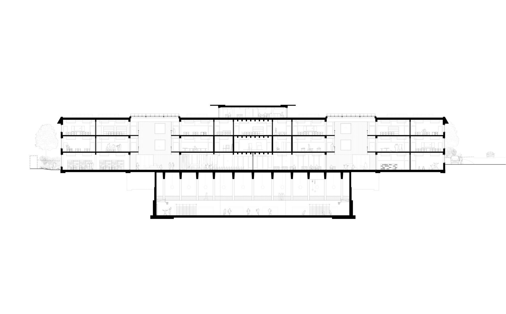 The sports hall is located underground. An attic level provides retreat spaces for staff. The architecture follows the principle of “simple building”: climatic intermediate zones enable resource-efficient construction and reference traditional building methods. The building is conceived as a porous urban element with multiple entrances, creating a warm, open learning environment through natural materials, exposed timber structures and green façades. The project combines urban integration, sustainable construction and flexible learning spaces into a versatile, community-oriented school campus.