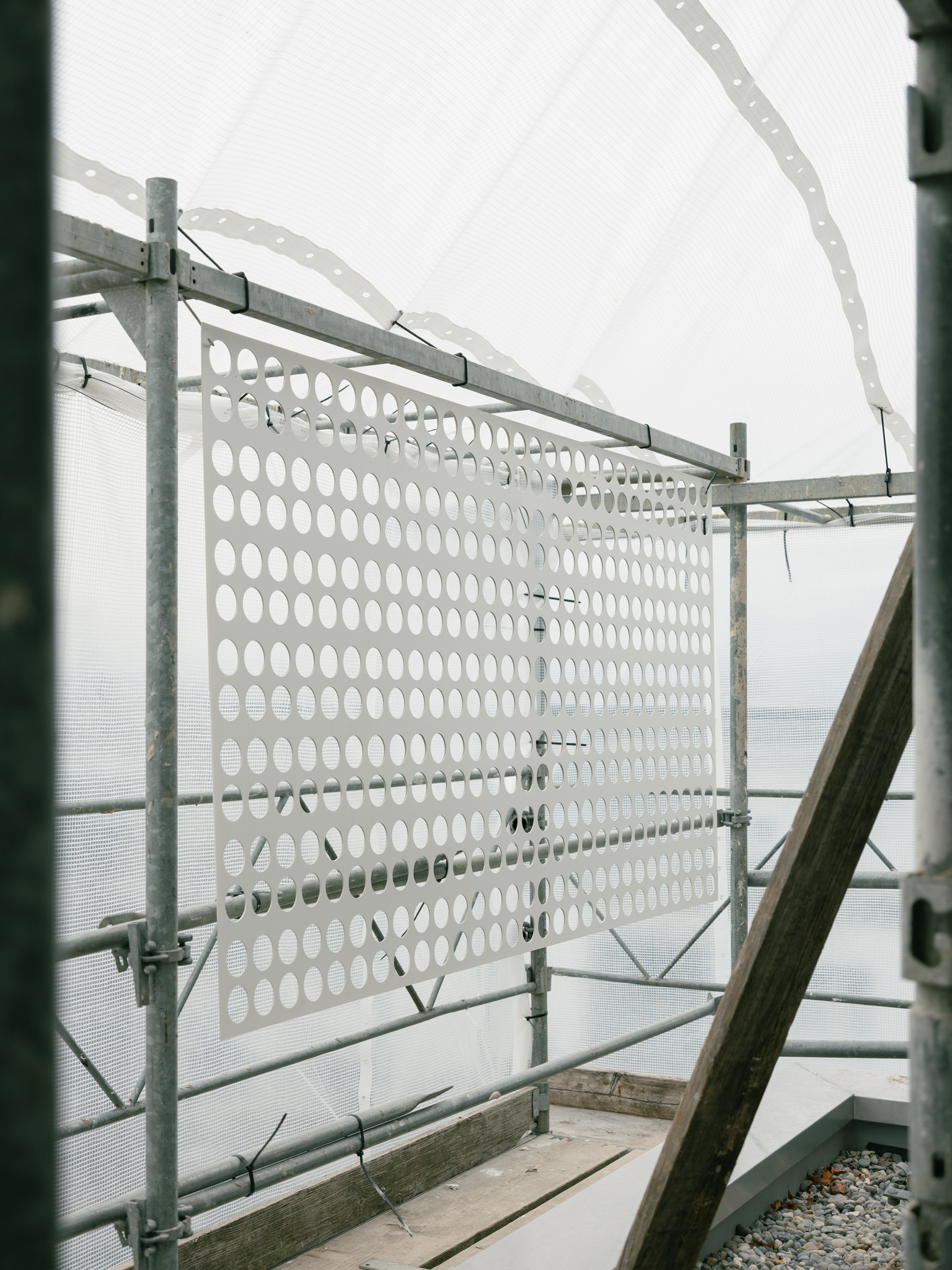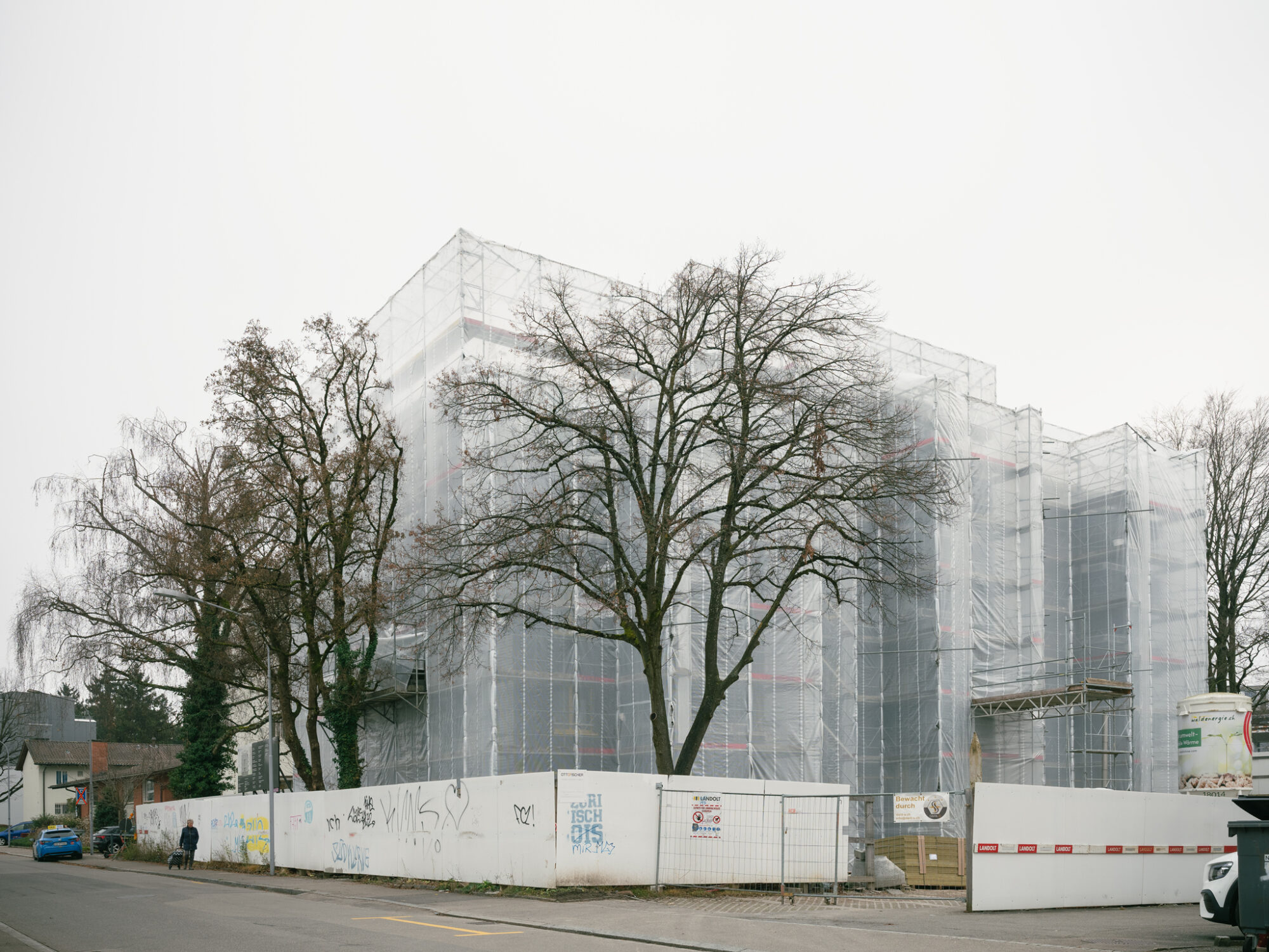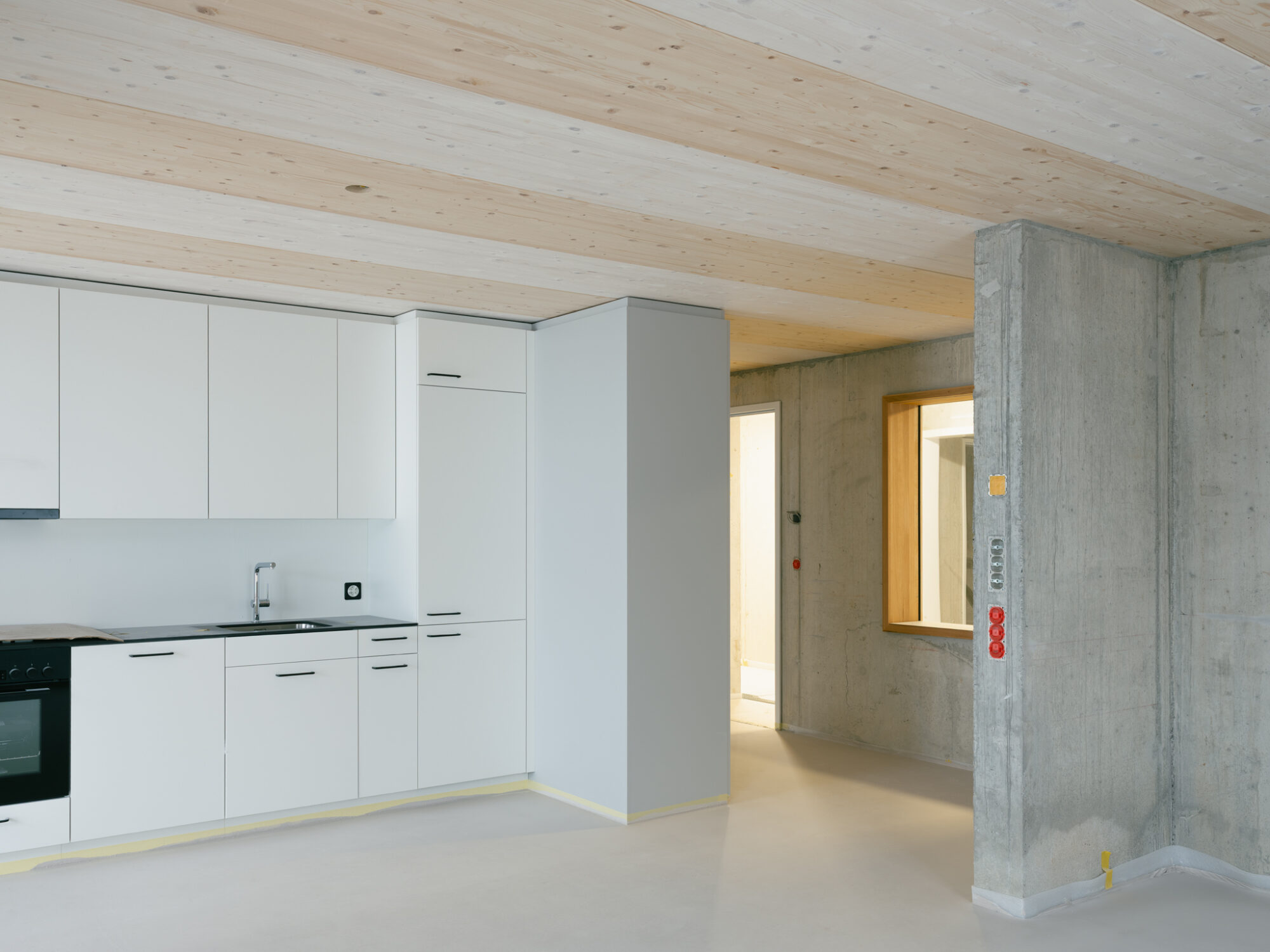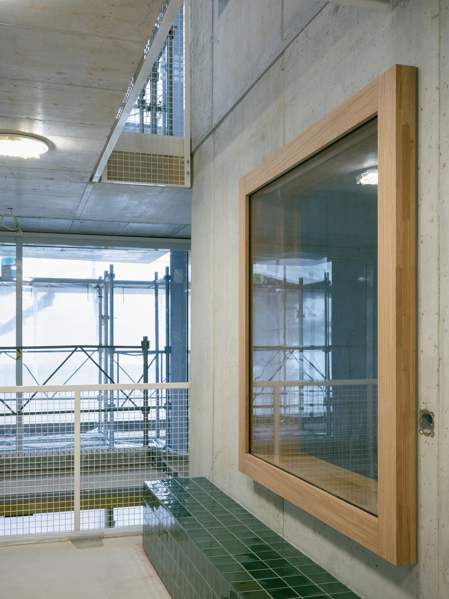 Was wäre, wenn sich Erschliessungsbereiche nicht wie anonyme Korridore anfühlen, sondern wie ein geteiltes Wohnzimmer? Das räumliche Gerüst besteht aus einer „rue intérieur“, die vertikal sowie horizontal alle Wohnungen erschliesst. Strukturell ist dieser Erschliessungsraum als Betonkonstruktion ausgeführt, im Gegensatz zum umliegenden Holzrahmenbau. Der Korridor erstreckt sich über die gesamte Gebäudelänge, wird durch Nischen und Aufweitungen gegliedert, und an beiden Enden, sowie über ein Oberlicht in der Mitte, mit Tageslicht versorgt. Parkett als Bodenbelag erzeugt eine warme und wohnliche Grundstimmung, und gibt der Erschliessung die Atmosphäre eines erweiterten Wohnbereiches. Jede Wohnung besitzt ein Fenster zur „rue intérieur“, das – über Vorhänge regulierbare – Einblicke in die Küche und vice versa ermöglicht. Geflieste Sitzbänke laden zum spontanen Verweilen und nachbarschaftlichen Plaudern ein, und erinnern an wohlig beheizte Kachelöfen in den Wintermonaten. Elemente wie eine eigene kleine Eingangslampe oder ein privates Postfach für hausinterne Mitteilungen bilden die Schwellenräume der Eingangsbereiche aus. In einer kleinen Wohnung zu wohnen kann sich so auch anfühlen als würde man ein eigenes Haus besitzen.