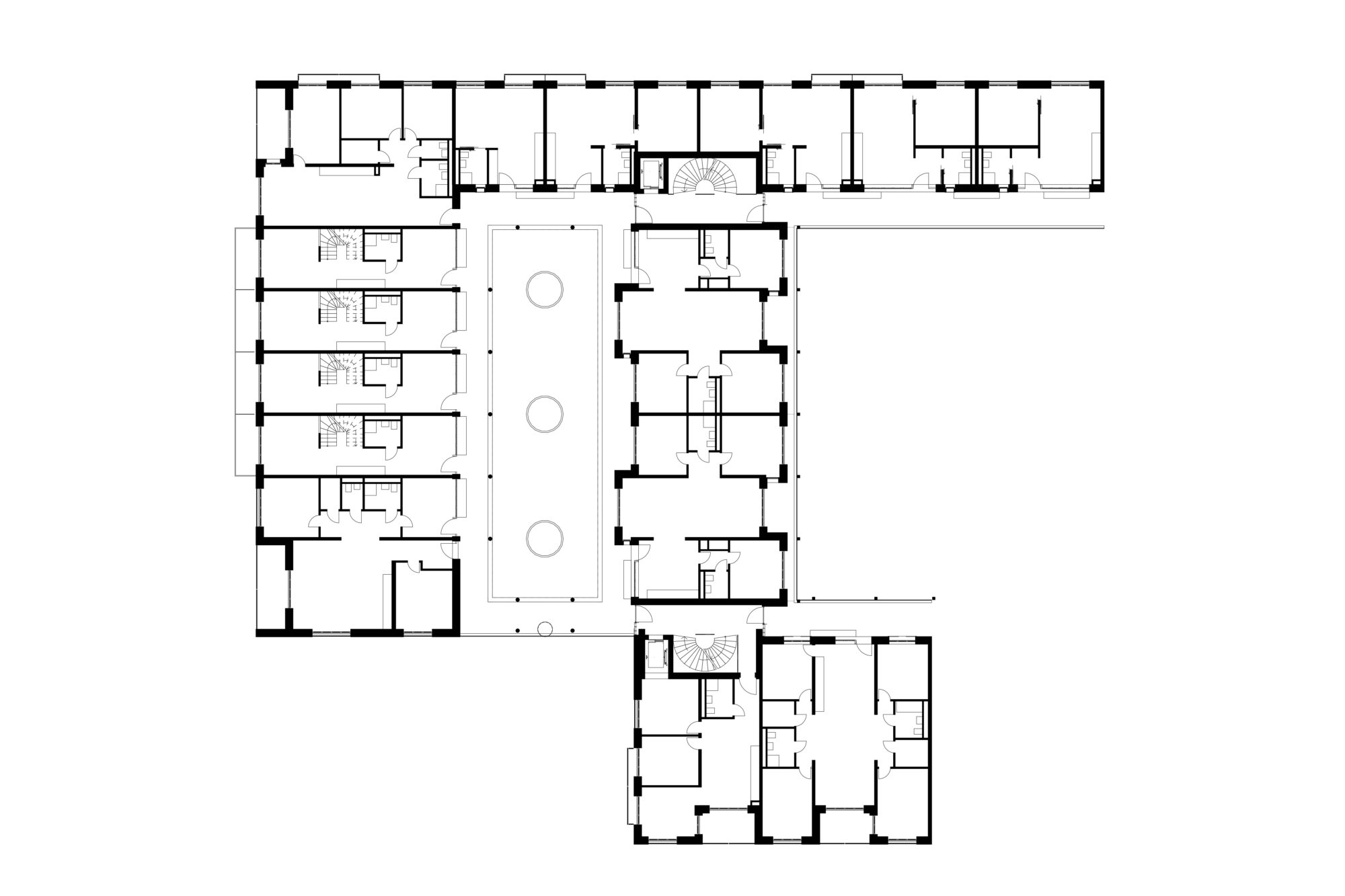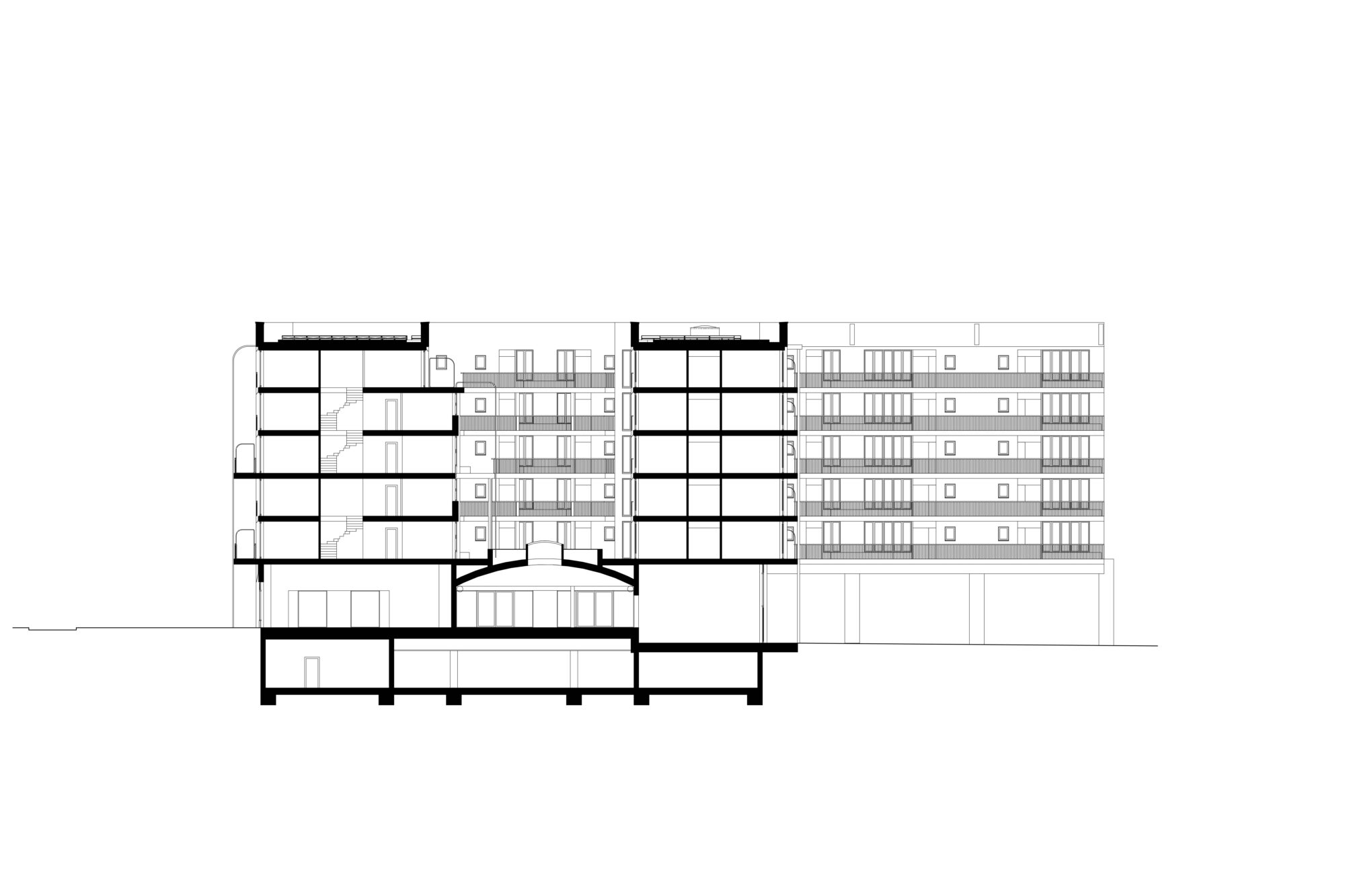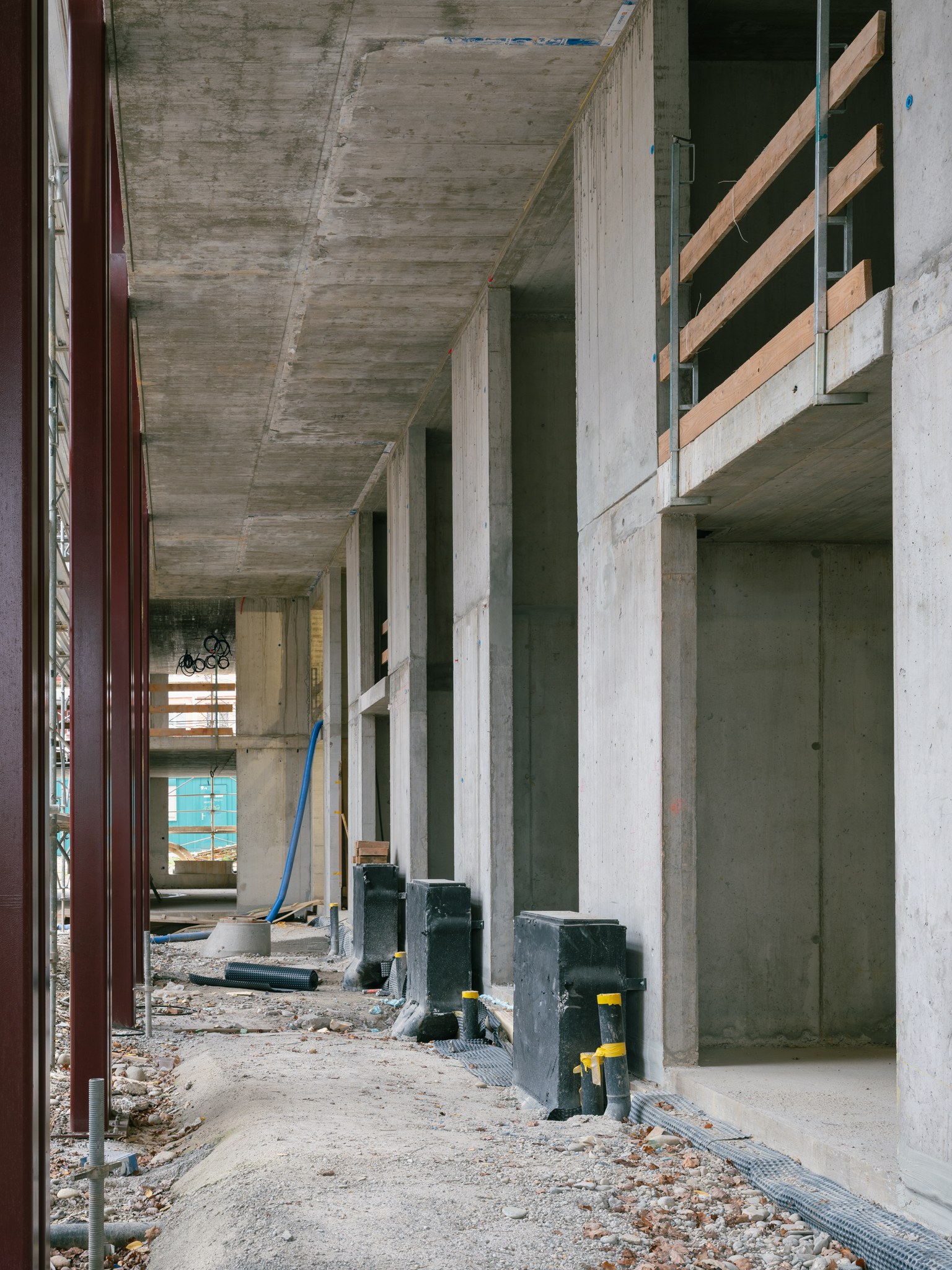 Die Laubengänge sind grosszügig bemessen, und bilden mit Sitzbänken ausgestattete Vorbereiche der jeweiligen Wohnungen aus. Auch in einer Geschosswohnung zu wohnen, kann sich so anfühlen als würde man ein eigenes Haus besitzen. Bereiche, die nicht als Fluchtweg dienen, werden auf dem Boden markiert und für private oder gemeinschaftliche Möblierung genutzt. Zum Grüngürtel hin befinden sich grössere Flächen, die für spontane nachbarschaftliche Zusammenkünfte genutzt werden können und die Gemeinschaft fördern.
