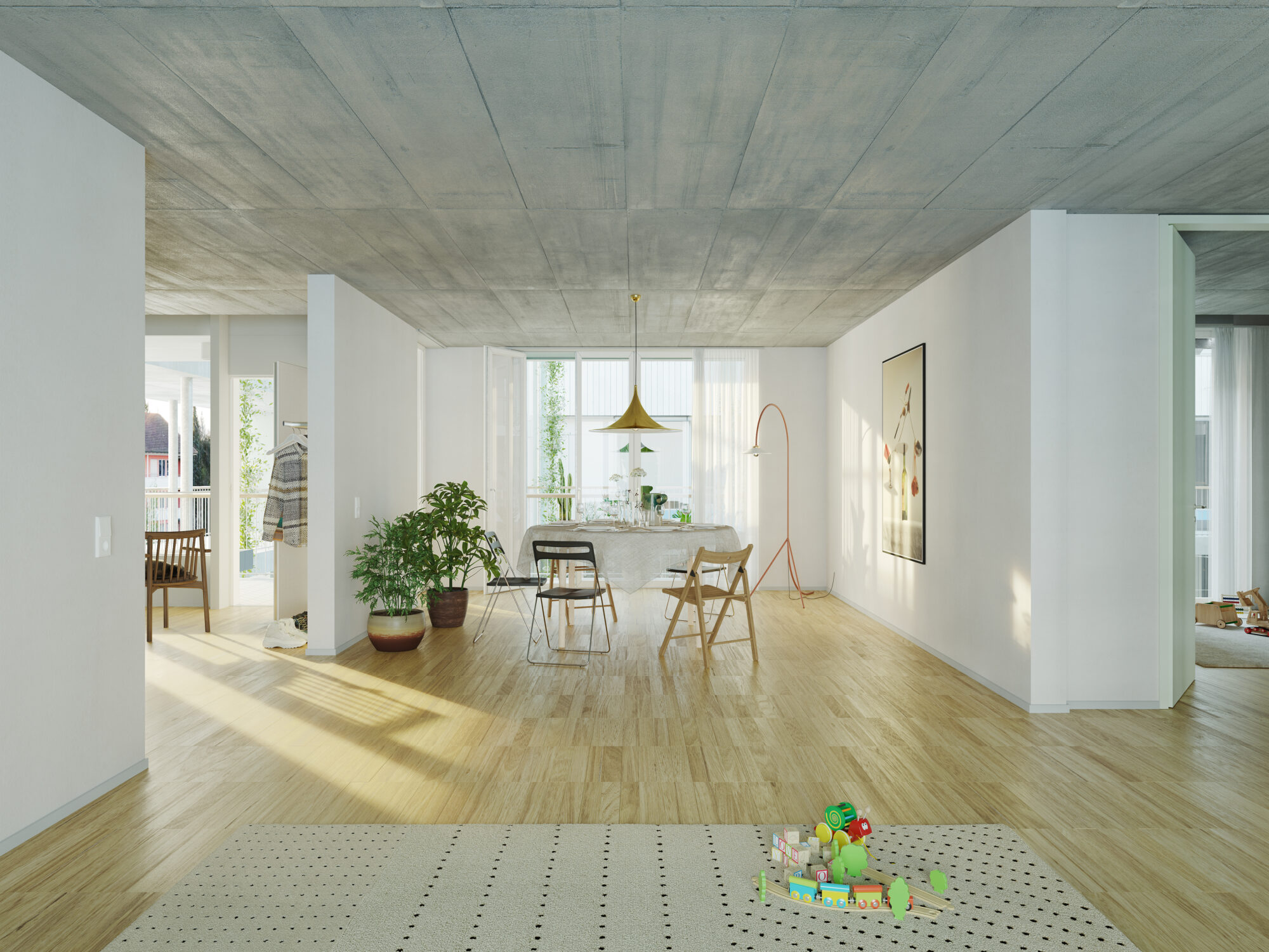 Auch die Geschosswohnungen reagieren spezifisch auf die Lage am einseitig geöffneten Innenhof. Der zwischen den beiden Höfen eingespannte Gebäudeteil wird mit zwei 4 1/2-Zimmer-Wohnungen bespielt. Durch die Öffnung erhalten auch diese Bewohnenden einen Ausblick zum Grüngürtel und Ensisheimerstrasse – eine Qualität, die durch ein sich in den Hof schiebendes, verglastes Erkerelement, zusätzlich verstärkt wird.