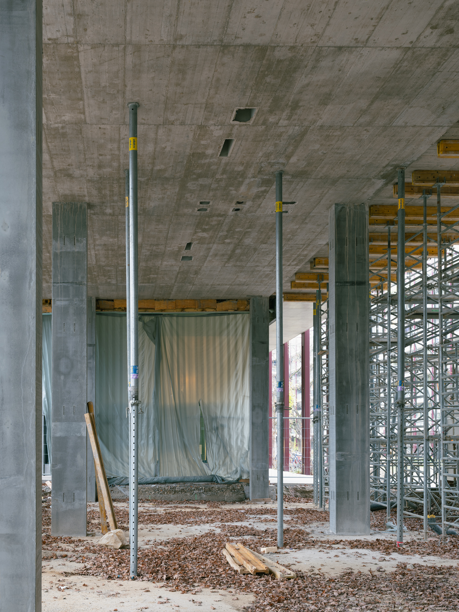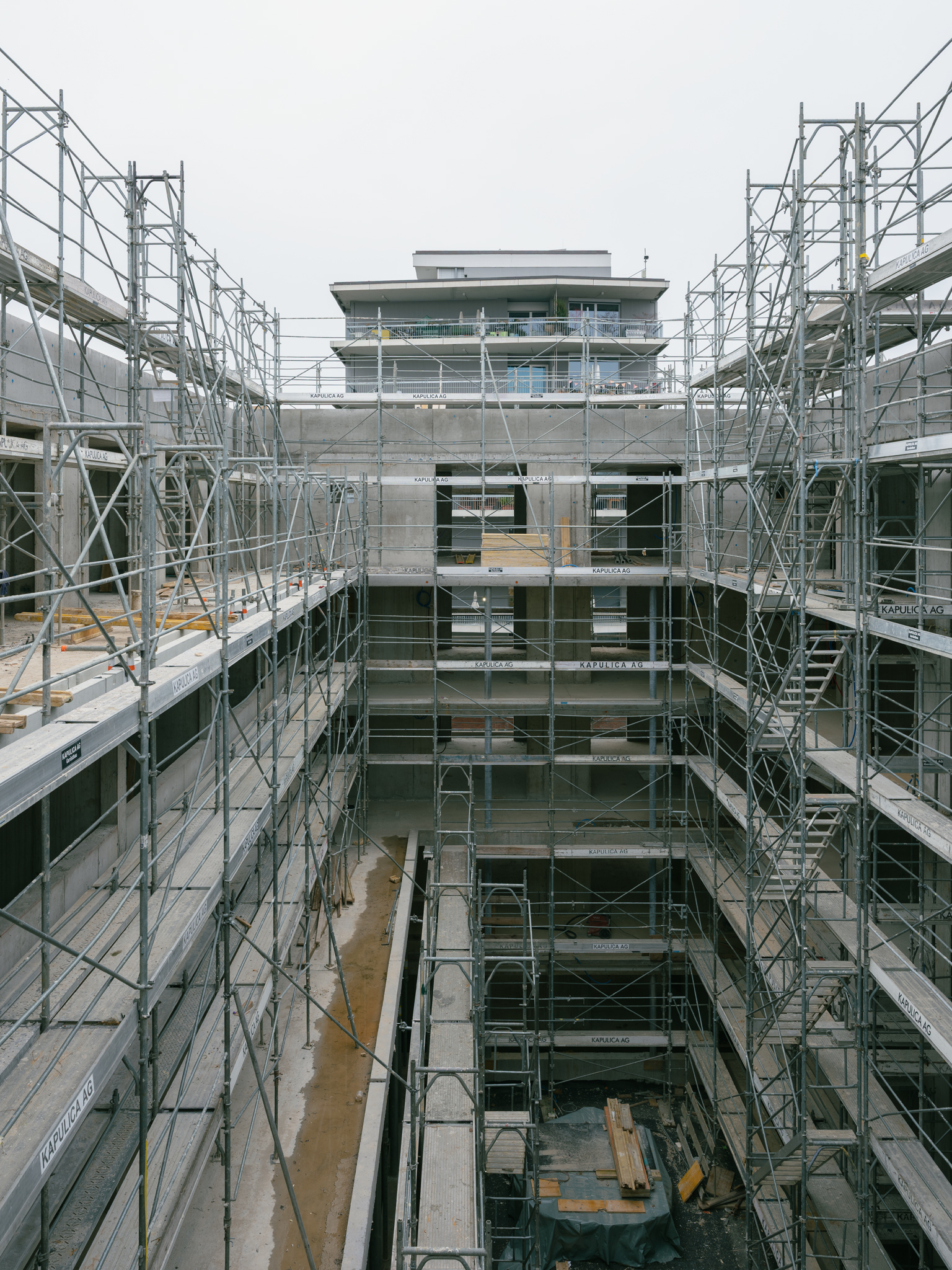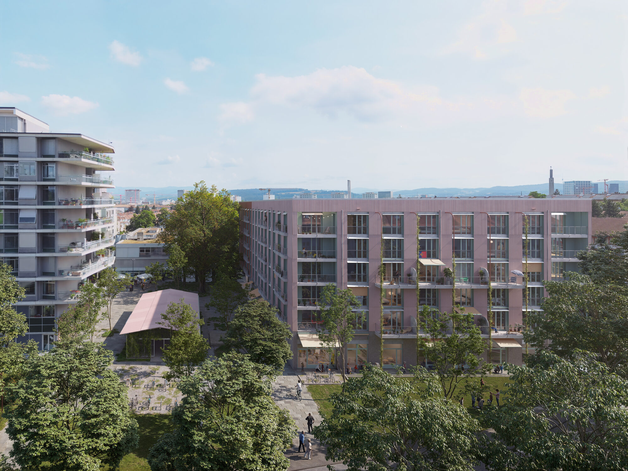 Um auch dem kleinen Hof des Kopfbaus eine angemessene Qualität zu verleihen, wird eine vom ersten bis fünften Geschoss reichende Öffnung auf der Ostseite vorgeschlagen. Von Aussen bleibt das Bild eines geschlossenes Gebäudevolumens im Sinne des Masterplans bestehen. Aus Von Innen entstehen Sichtbezüge zum Ausläufer des Grüngürtels, von dem alle Wohnungen profitieren. Neben der wesentlich besseren Luftdurchströmung, wird auch die Belichtungsqualität des Hofs durch die Öffnung signifikant erhöht. Mit üppiger Begrünung bepflanzt, ist dies ein angenehmer, identitätsstiftender und gemeinschaftlicher Ort des Ankommens, über den sich die Bewohnenden in die mehrheitlich über Laubengänge erschlossenen Wohnungen verteilen. Rankpflanzen wachsen die Fassaden empor, und unterstreichen die durch Naturholz geprägte natürliche Stimmung im Hof.