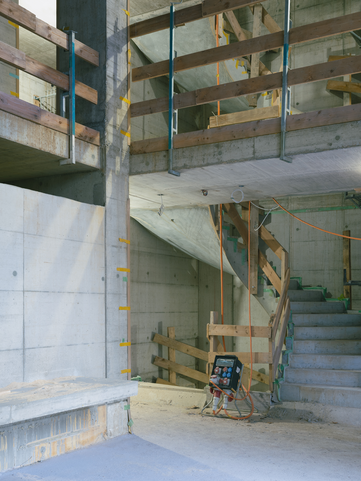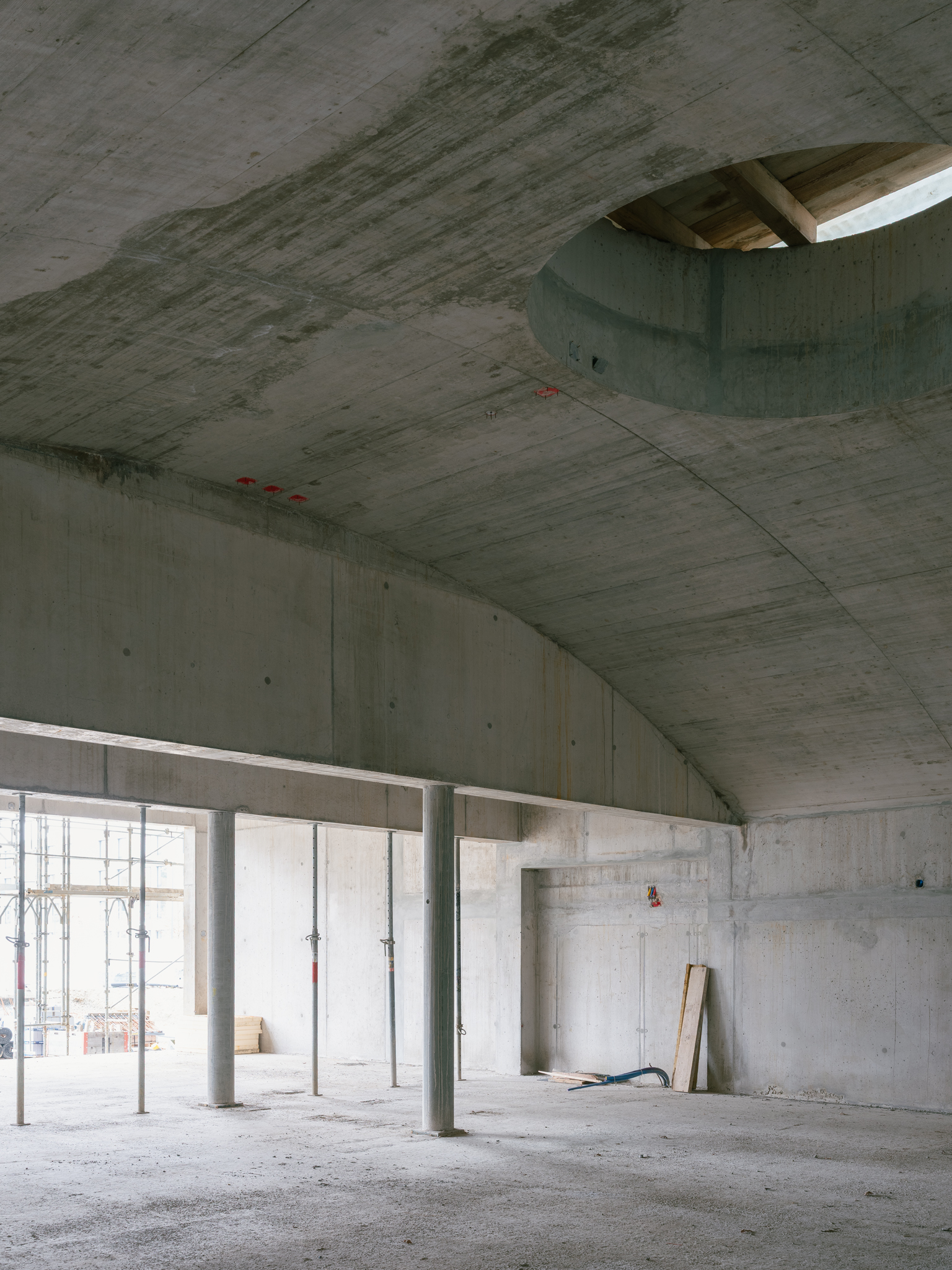 Grosszügige doppelgeschossige Eingangshallen markieren den Zugang vom Wohnhof, und verringern die optische Distanz zum über einem Zwischengeschoss liegenden 1. Obergeschoss, auf dem die Wohnungen des Kopfbaus beginnen. Neben dem Eingangsbereich liegen auch die über Glasbausteine und innenliegende Fenster belichteten Waschräume. So entstehen einladende und kommunikative Ankunftsorte, die vielfältige Blickbeziehungen zwischen Innen und Aussen aufbauen.