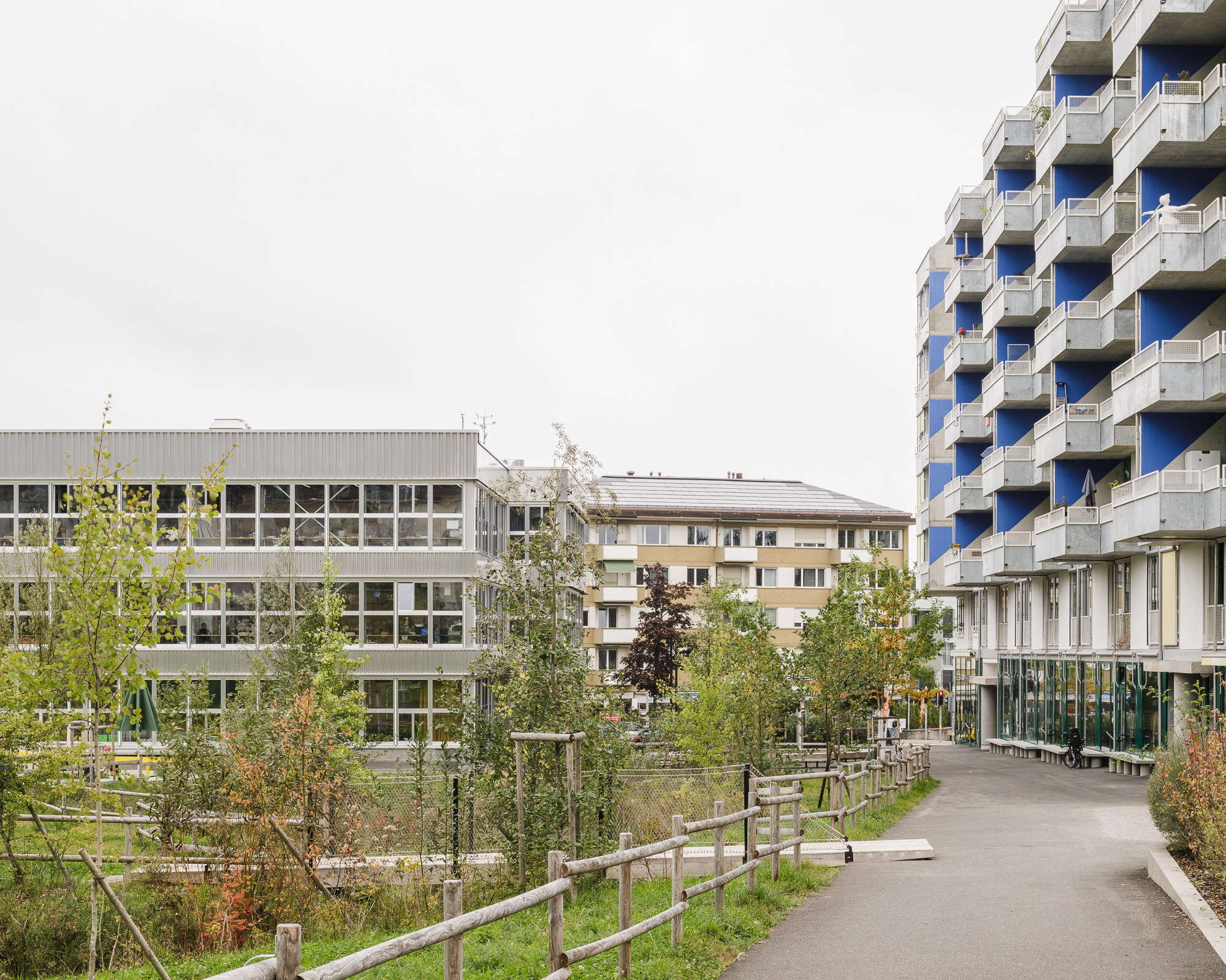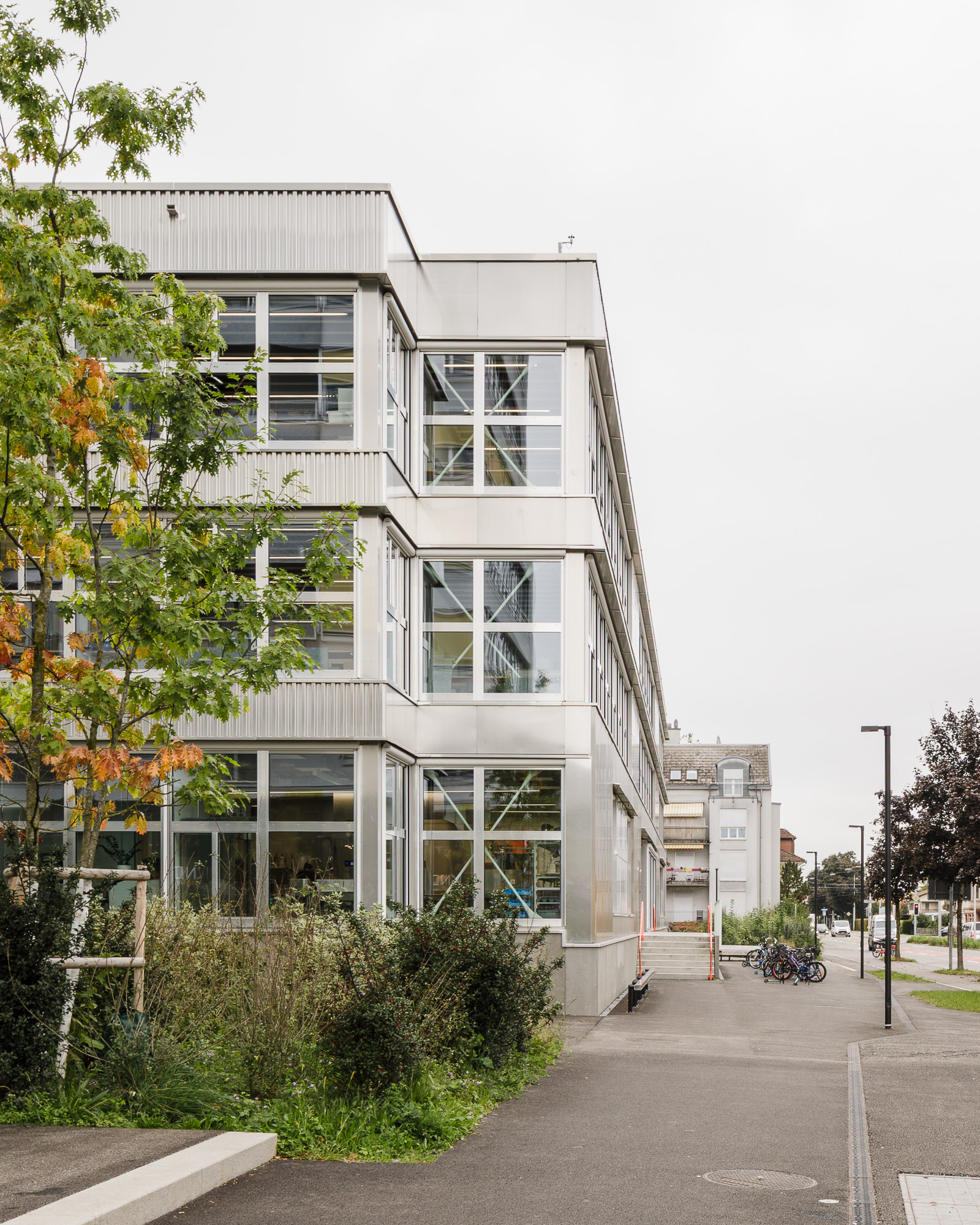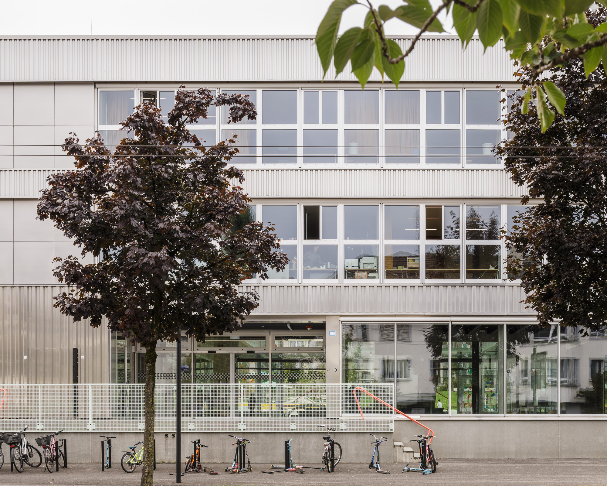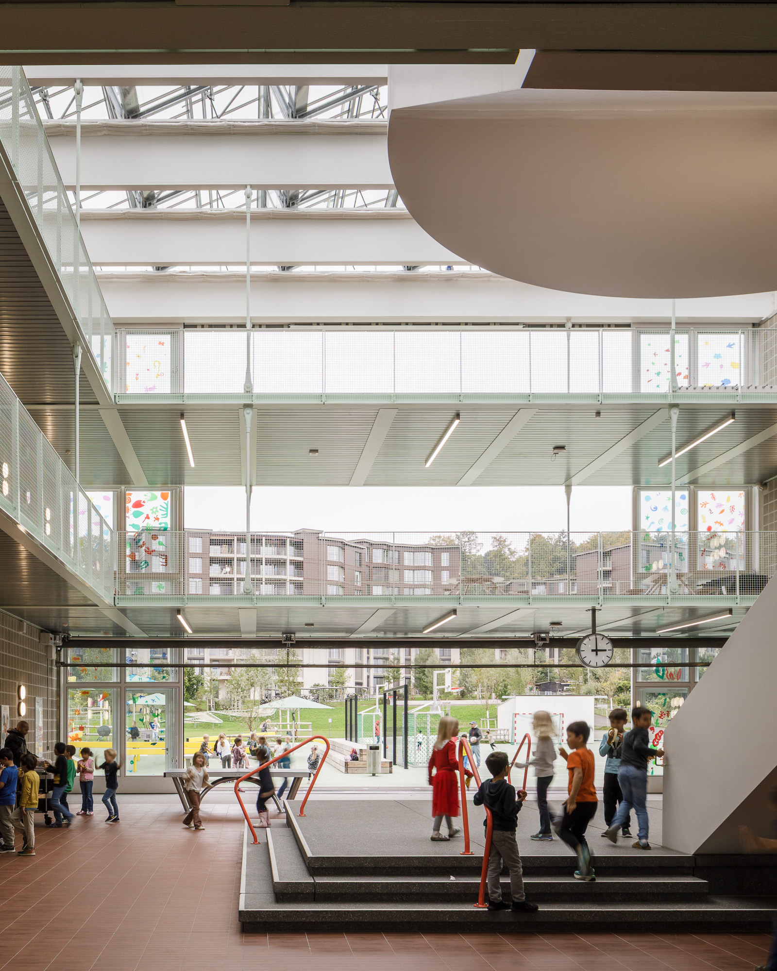 Das Herzstück der Schulanlage Guggach in Zürich ist das Foyer – eine unbeheizte Zwischenklimazone, die sich flexibel den wechselnden Jahreszeiten anpasst. Im Sommer offen und im Winter geschlossen, kann das Klima mit handbetriebenen Schiebetoren gesteuert werden. Das Foyer öffnet sich einladend zum Quartierpark – ähnlich einer großen Bühne. Hier starten die Kinder ihren Tag mit dem gemeinsamen Singen am Montagmorgen, lernen in den Freiluftklassenzimmern und geniessen ihre Pausen im Freien.