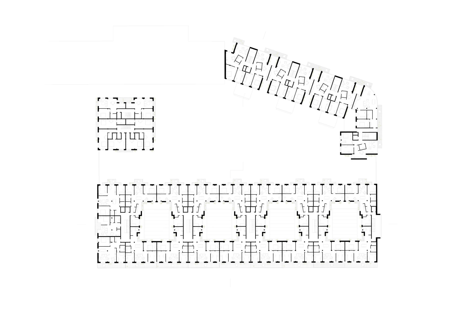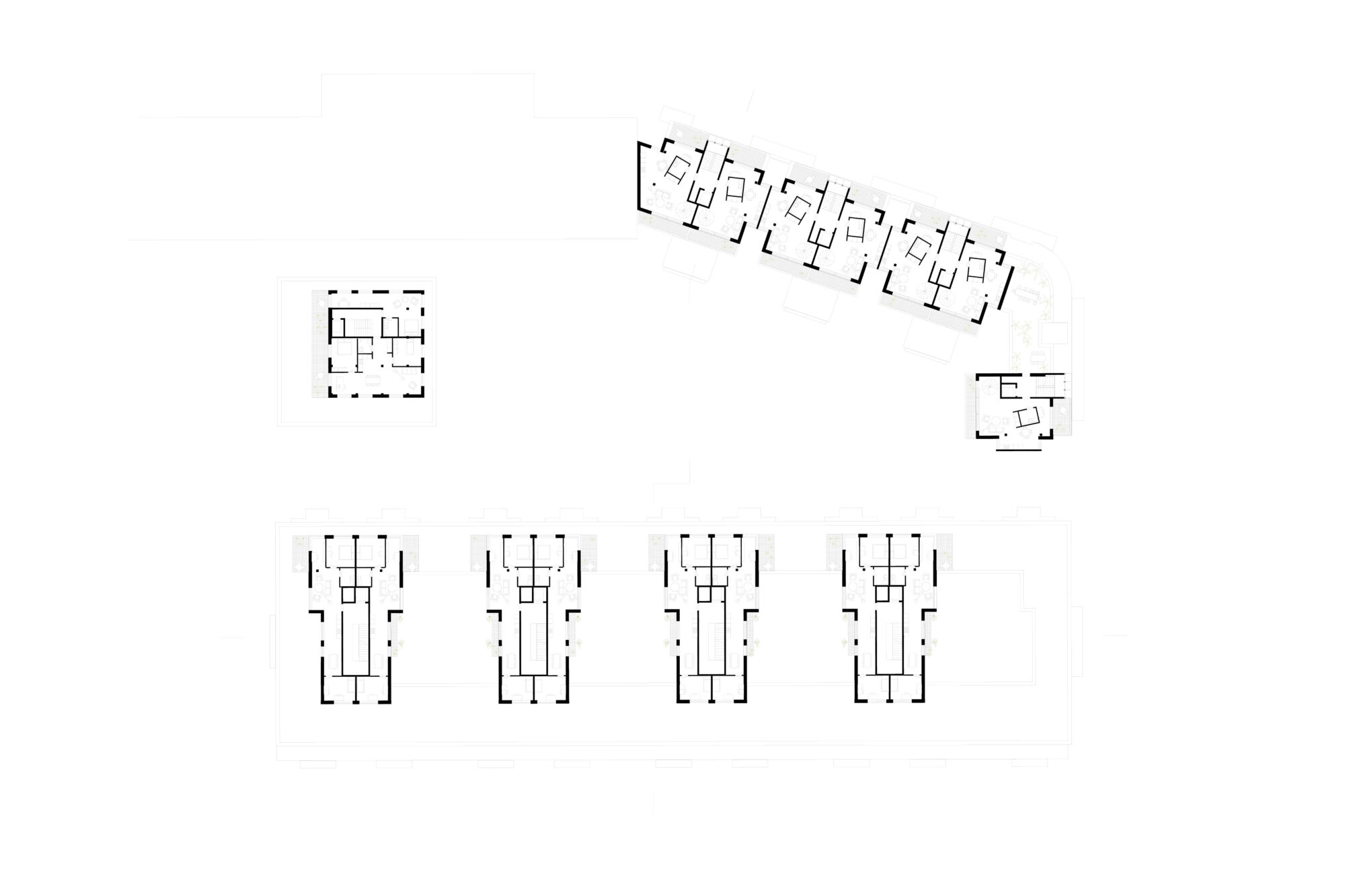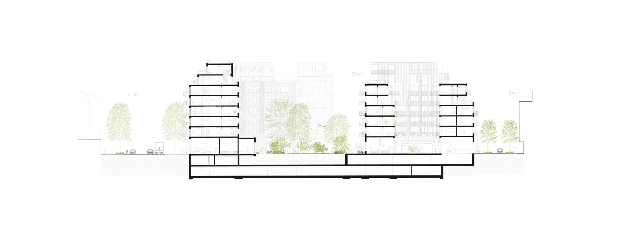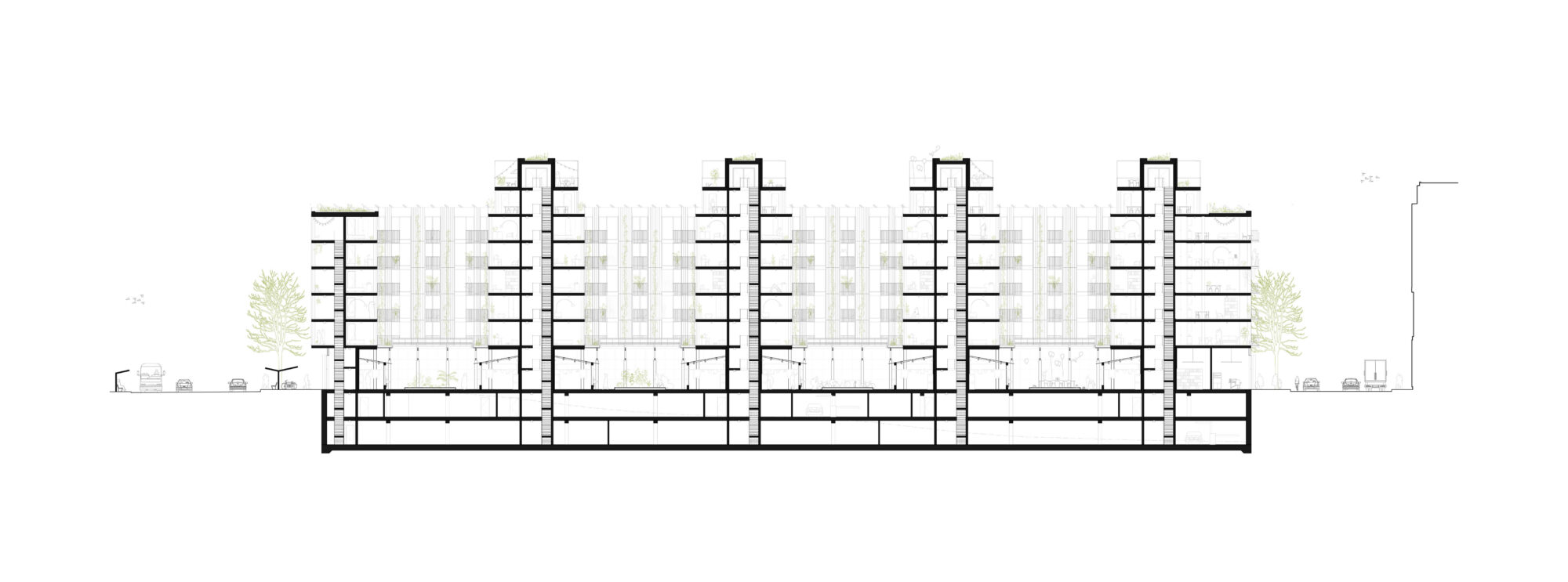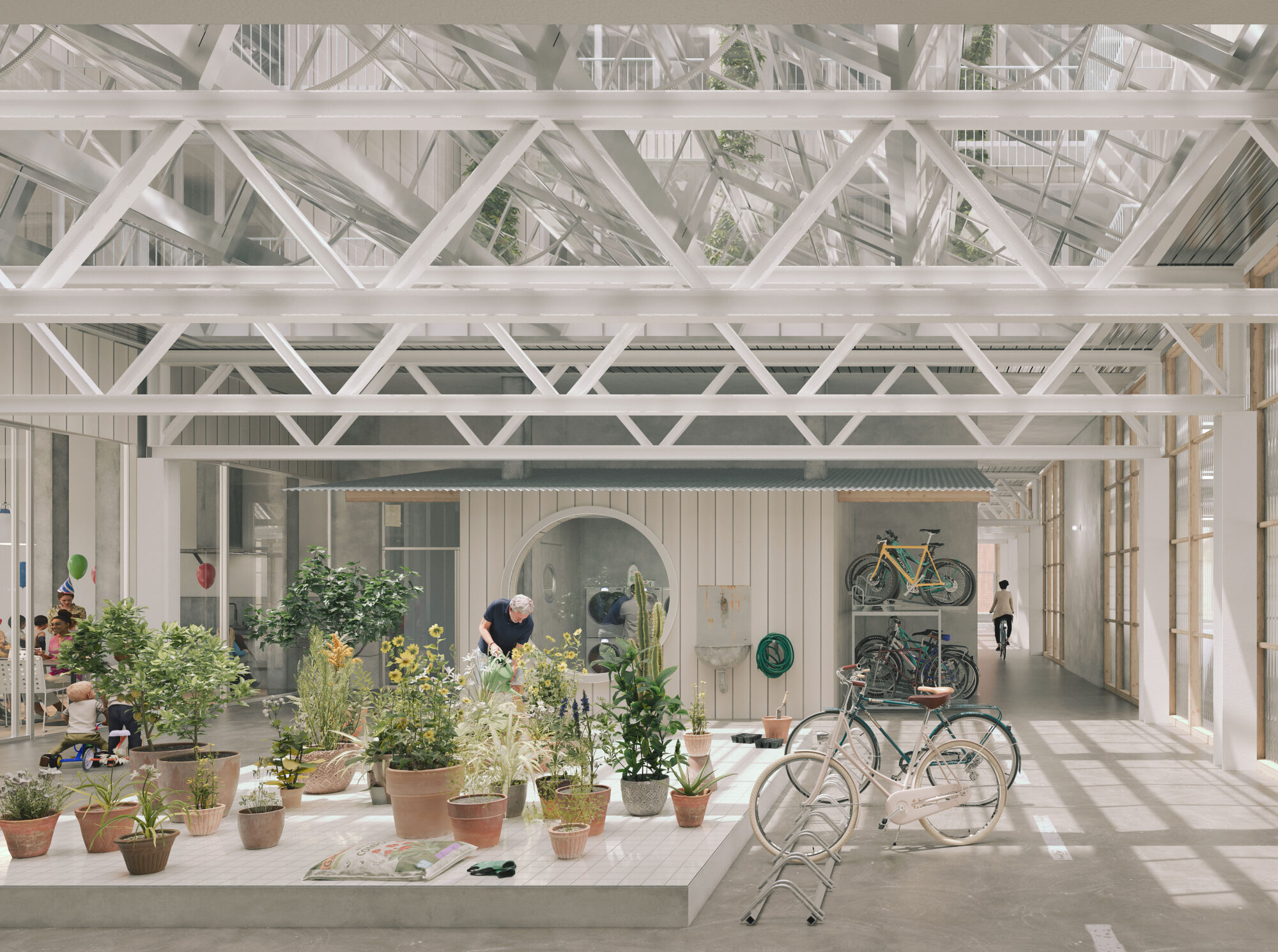 Ein zentrales Element ist das hybride urbane Erdgeschoss des Langhauses: ein überhohes, teilweise unbeheiztes Erdgeschoss als flexibler Begegnungsraum für Mobilität, Sport, Gewerbe, Gemeinschaft und Bildung. Velorouten, Werkstätten, Wasch- und Möglichkeitsräume sowie saisonal nutzbare Zonen fördern soziale Interaktion. Drei klimatische Schichten – Aussenraum, Zwischenklima und Innenklima – ermöglichen unterschiedliche Nutzungen und einfache Bauweisen.