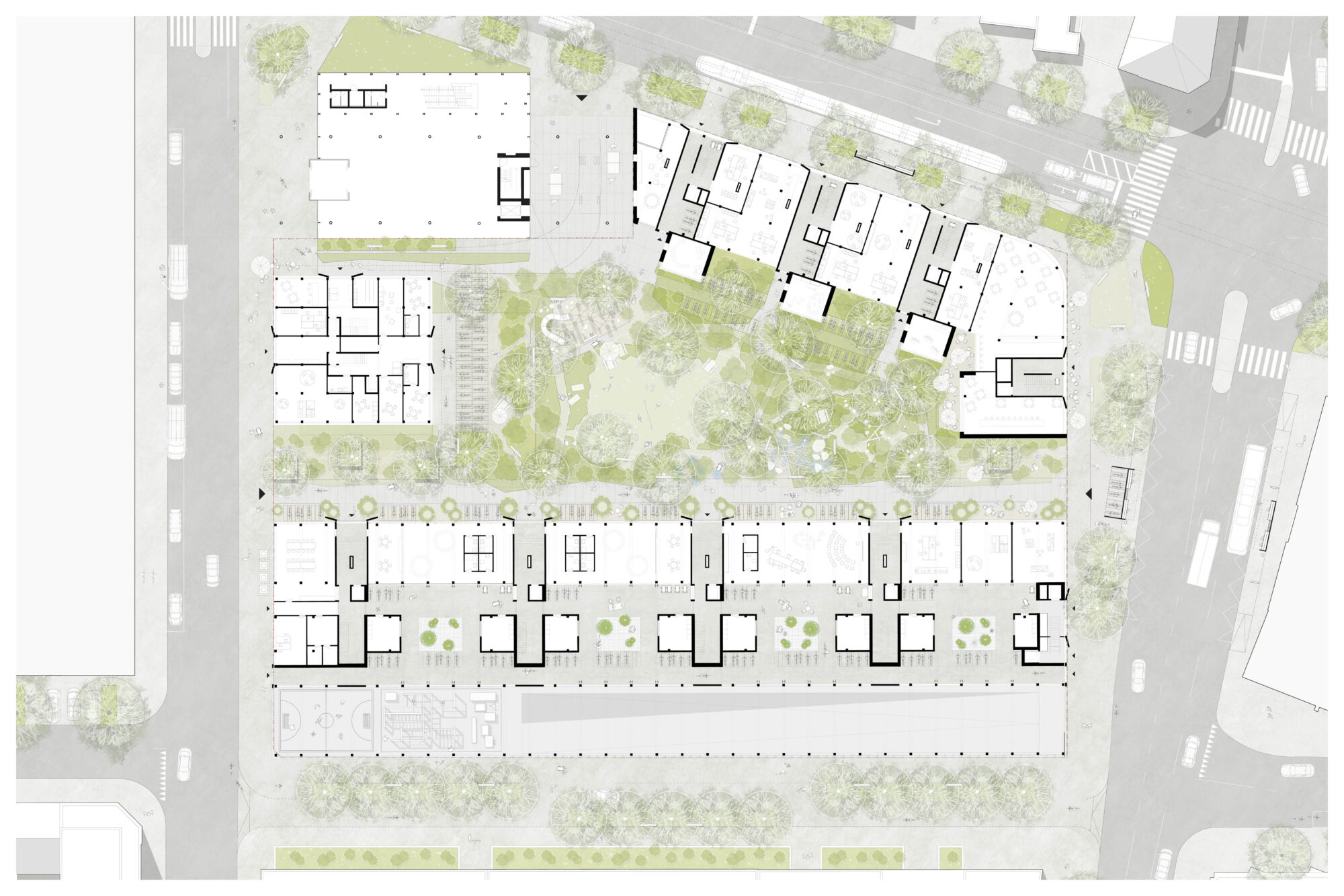 Das Projekt schlägt anstelle einer homogenen Überbauung ein Ensemble aus drei Neubauten und der bestehenden Messehalle 1E vor, die sich um einen zentralen, ökologisch gestalteten Grünraum gruppieren. Dieser Hof bildet das soziale und klimatische Herzstück, öffnet sich zur Feldberg- und Maulbeerstrasse und ermöglicht Kaltluftströmungen zur Reduktion des städtischen Wärmeinseleffekts. Die Baukörper reagieren jeweils auf ihre Lage: eine lärmschützende Eckbebauung am Riehenring, ein kompaktes Punkthaus mit kleineren Wohnungen an der Maulbeerstrasse und ein langgestreckter Bau entlang der Isteinerstrasse mit öffentlichen, gewerblichen und gemeinschaftlichen Nutzungen.