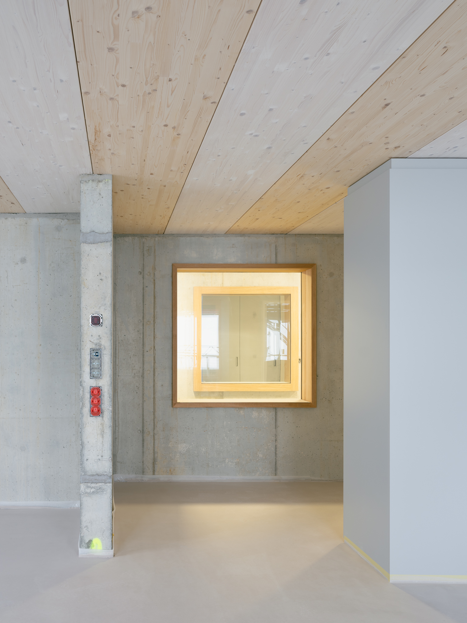 Was wäre, wenn sich Erschliessungsbereiche nicht wie anonyme Korridore anfühlen, sondern wie ein geteiltes Wohnzimmer? Das räumliche Gerüst besteht aus einer „rue intérieur“, die vertikal sowie horizontal alle Wohnungen erschliesst. Strukturell ist dieser Erschliessungsraum als Betonkonstruktion ausgeführt, im Gegensatz zum umliegenden Holzrahmenbau. Der Korridor erstreckt sich über die gesamte Gebäudelänge, wird durch Nischen und Aufweitungen gegliedert, und an beiden Enden, sowie über ein Oberlicht in der Mitte, mit Tageslicht versorgt. Parkett als Bodenbelag erzeugt eine warme und wohnliche Grundstimmung, und gibt der Erschliessung die Atmosphäre eines erweiterten Wohnbereiches. Jede Wohnung besitzt ein Fenster zur „rue intérieur“, das – über Vorhänge regulierbare – Einblicke in die Küche und vice versa ermöglicht. Geflieste Sitzbänke laden zum spontanen Verweilen und nachbarschaftlichen Plaudern ein, und erinnern an wohlig beheizte Kachelöfen in den Wintermonaten. Elemente wie eine eigene kleine Eingangslampe oder ein privates Postfach für hausinterne Mitteilungen bilden die Schwellenräume der Eingangsbereiche aus. In einer kleinen Wohnung zu wohnen kann sich so auch anfühlen als würde man ein eigenes Haus besitzen.