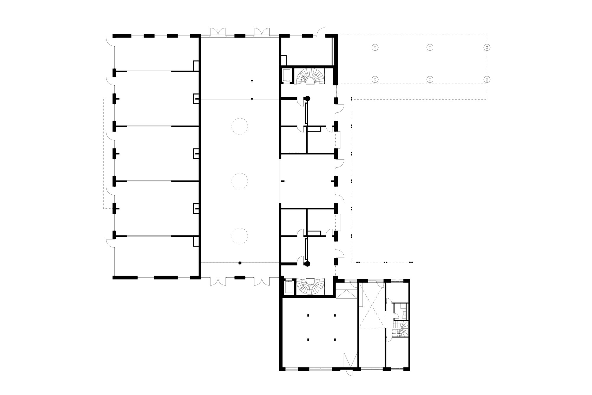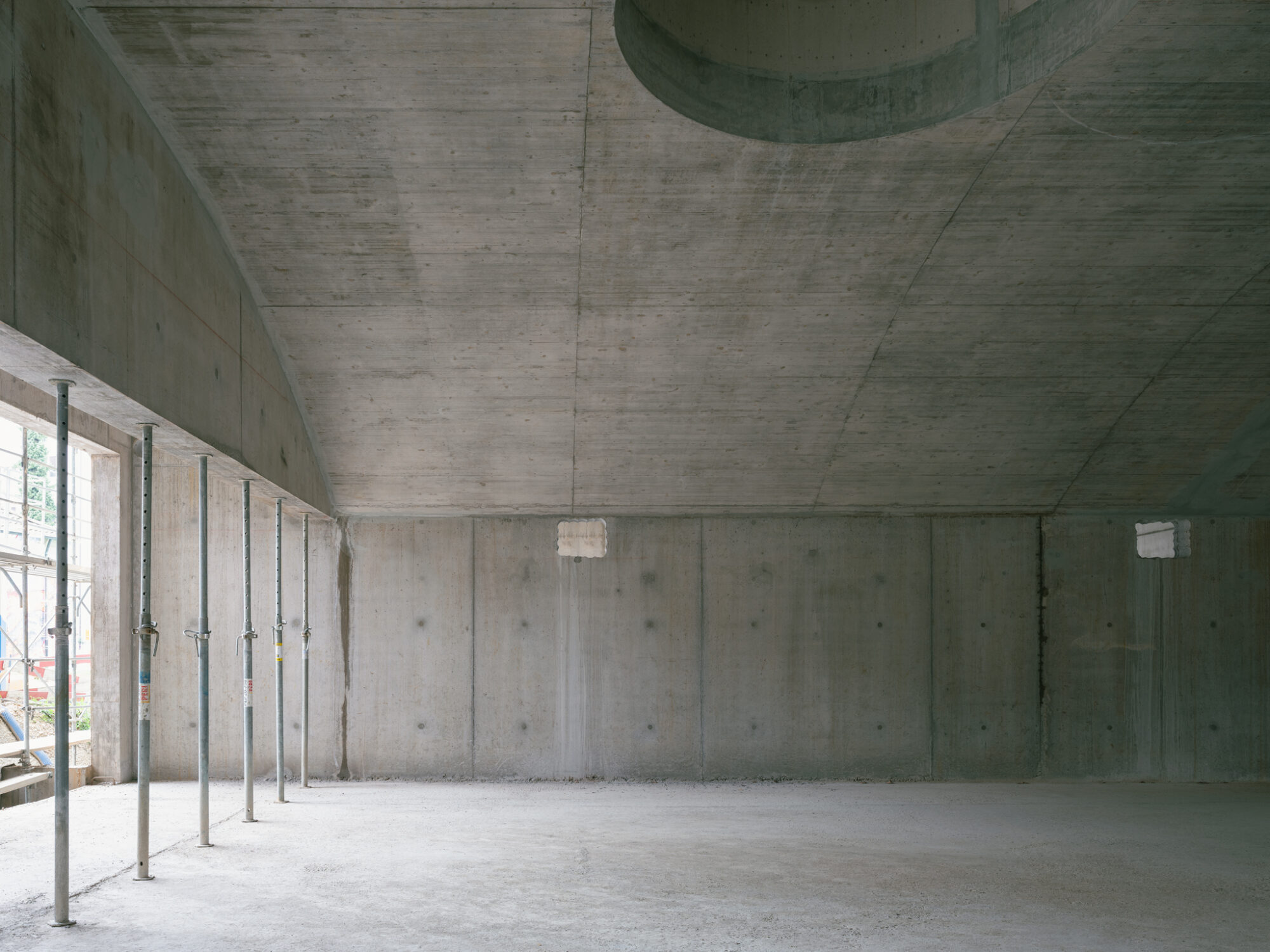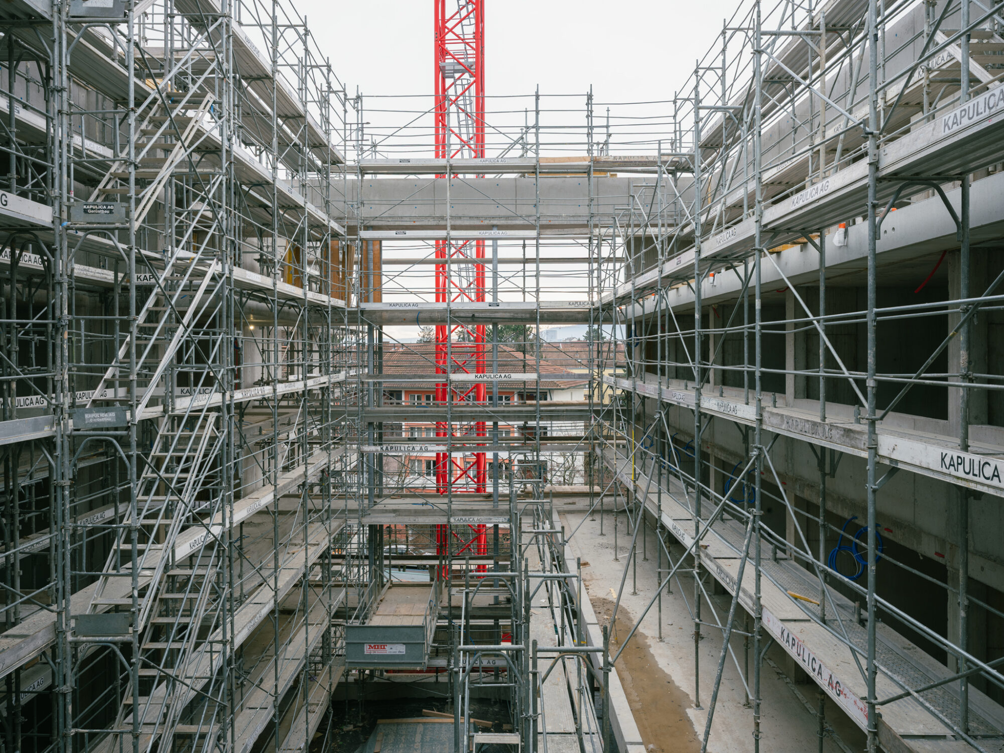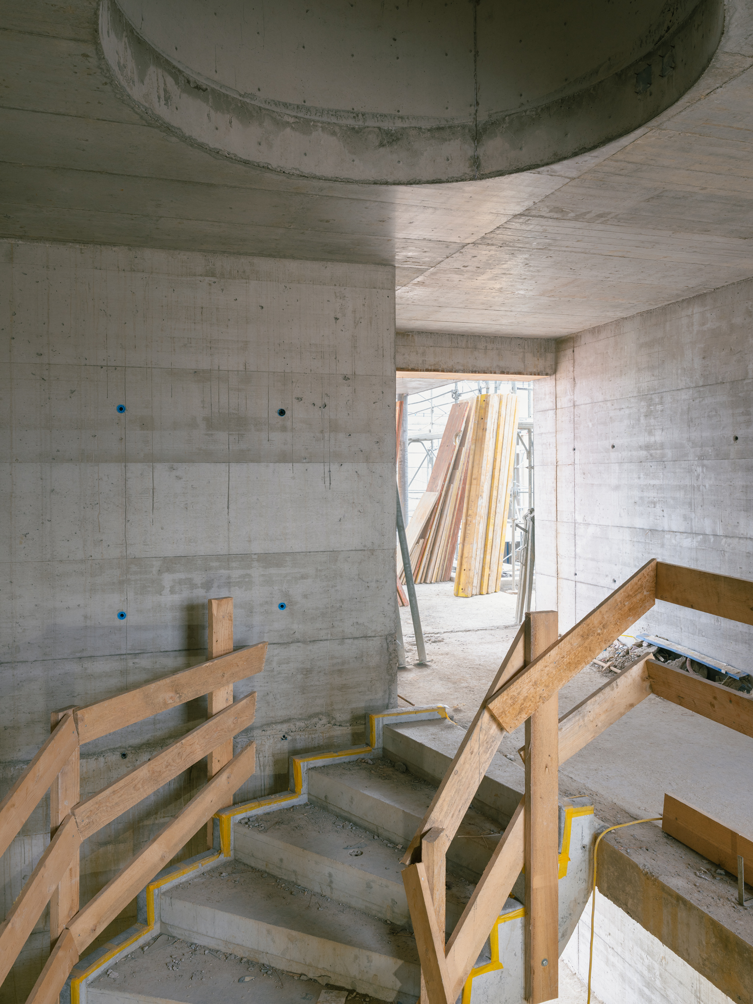 Grosszügige doppelgeschossige Eingangshallen markieren den Zugang vom Wohnhof, und verringern die optische Distanz zum über einem Zwischengeschoss liegenden 1. Obergeschoss, auf dem die Wohnungen des Kopfbaus beginnen. Neben dem Eingangsbereich liegen auch die über Glasbausteine und innenliegende Fenster belichteten Waschräume. So entstehen einladende und kommunikative Ankunftsorte, die vielfältige Blickbeziehungen zwischen Innen und Aussen aufbauen.