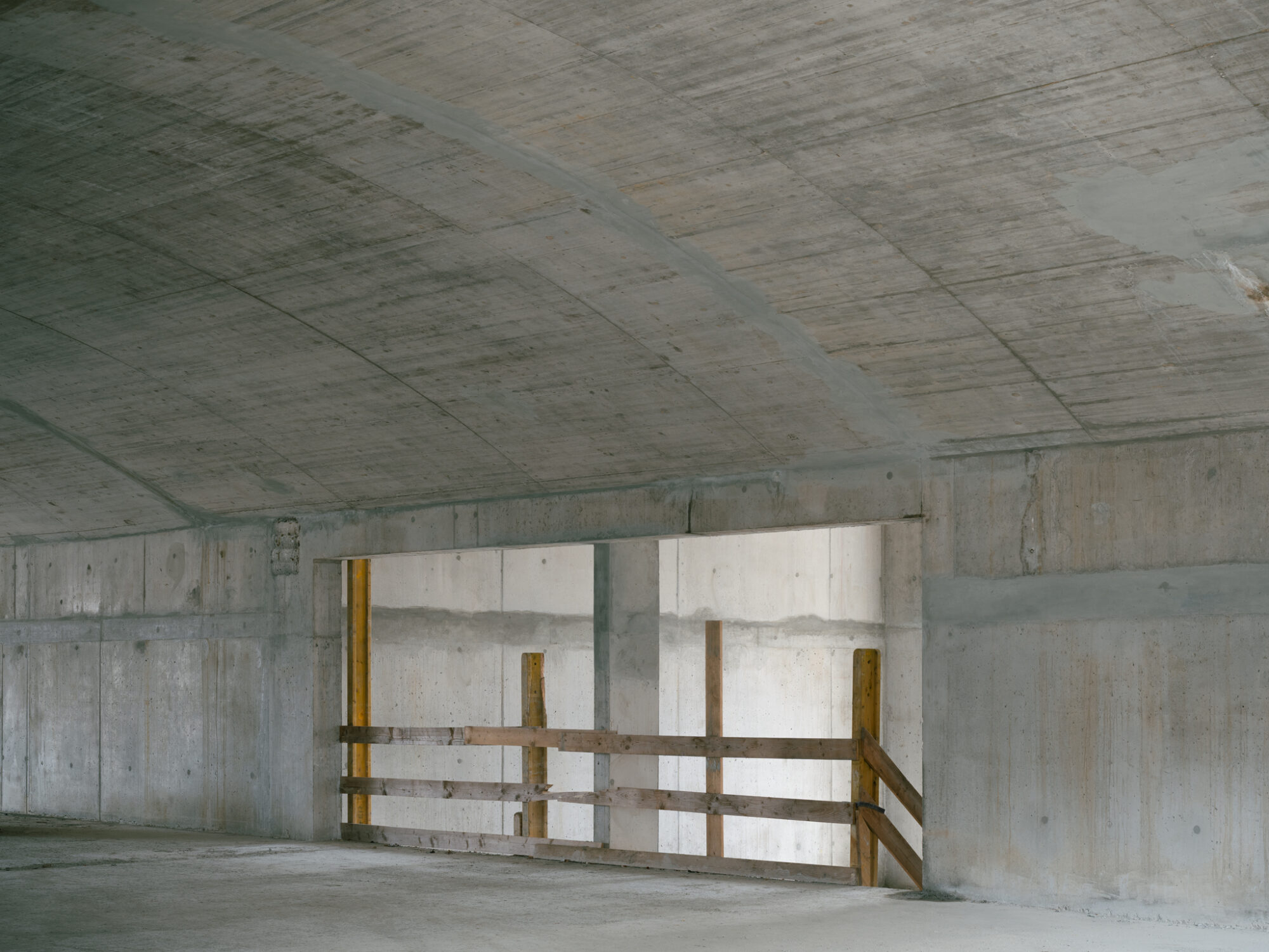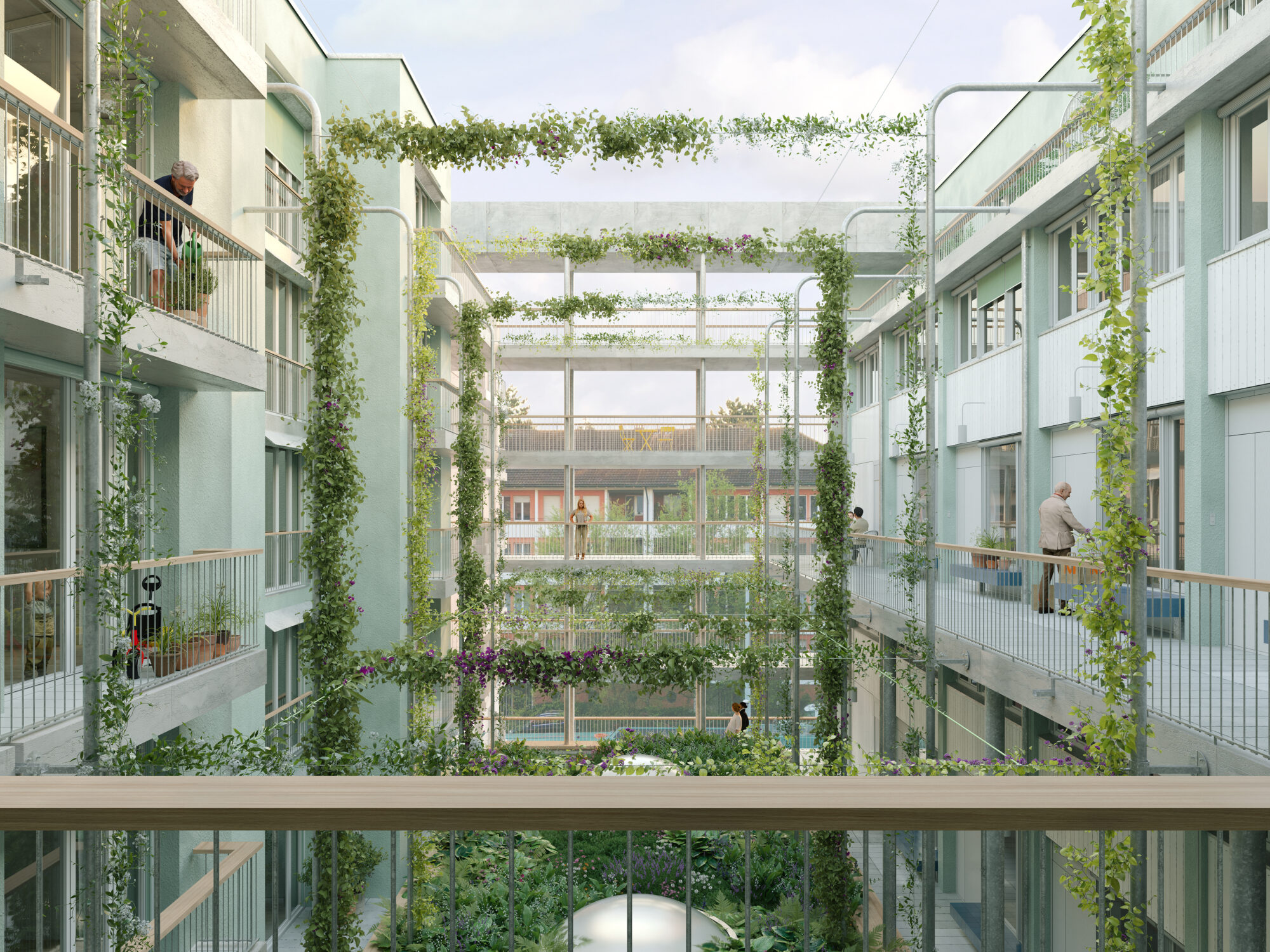 Um auch dem kleinen Hof des Kopfbaus eine angemessene Qualität zu verleihen, wird eine vom ersten bis fünften Geschoss reichende Öffnung auf der Ostseite vorgeschlagen. Von Aussen bleibt das Bild eines geschlossenes Gebäudevolumens im Sinne des Masterplans bestehen. Aus Von Innen entstehen Sichtbezüge zum Ausläufer des Grüngürtels, von dem alle Wohnungen profitieren. Neben der wesentlich besseren Luftdurchströmung, wird auch die Belichtungsqualität des Hofs durch die Öffnung signifikant erhöht. Mit üppiger Begrünung bepflanzt, ist dies ein angenehmer, identitätsstiftender und gemeinschaftlicher Ort des Ankommens, über den sich die Bewohnenden in die mehrheitlich über Laubengänge erschlossenen Wohnungen verteilen. Rankpflanzen wachsen die Fassaden empor, und unterstreichen die durch Naturholz geprägte natürliche Stimmung im Hof.