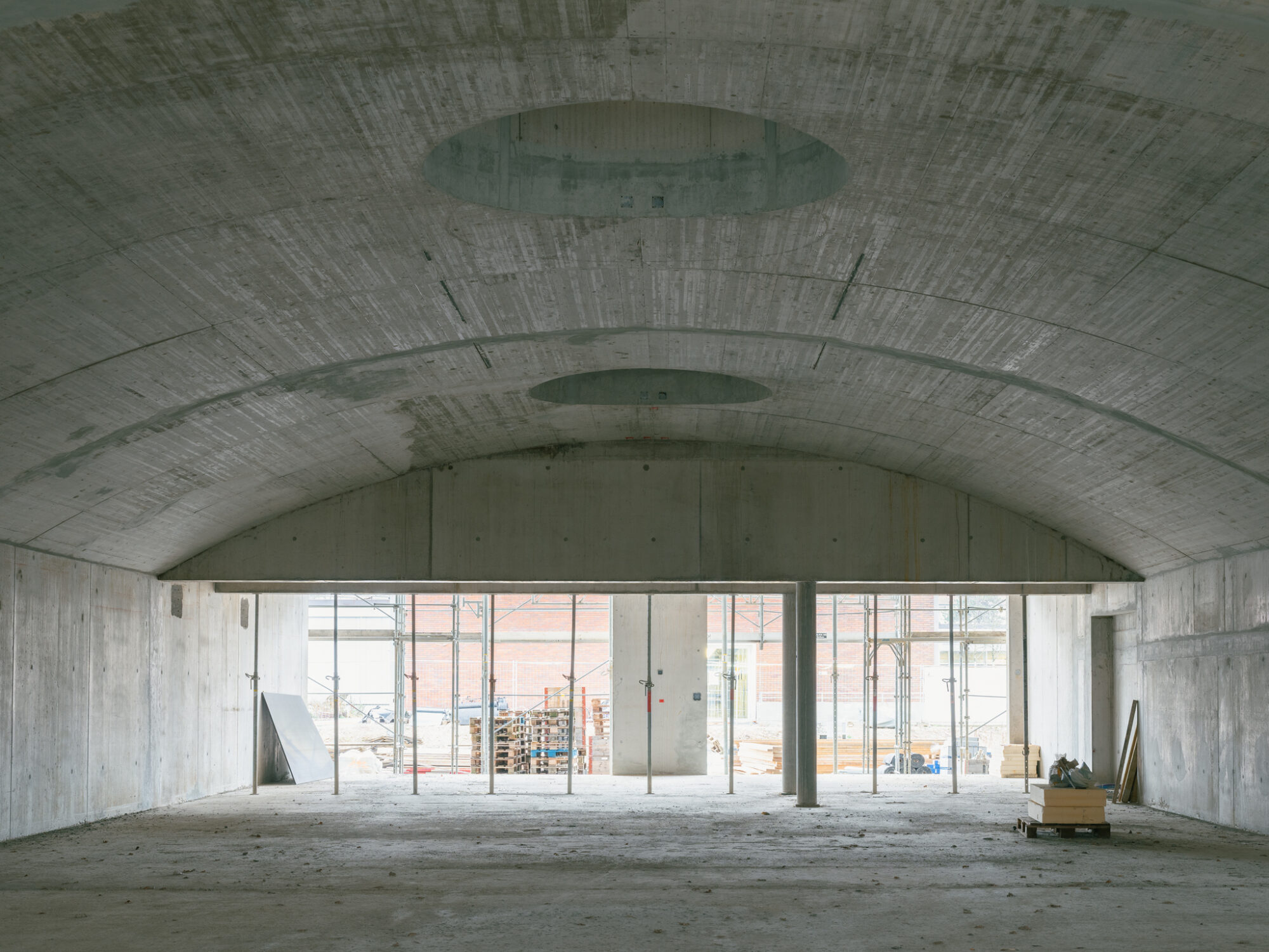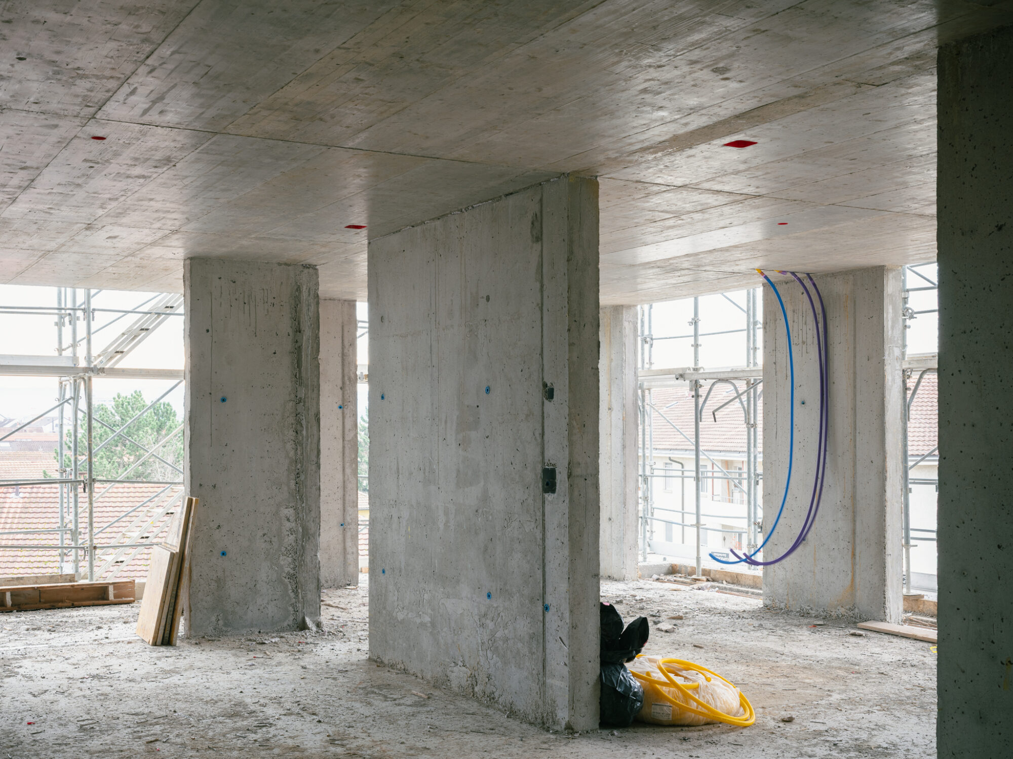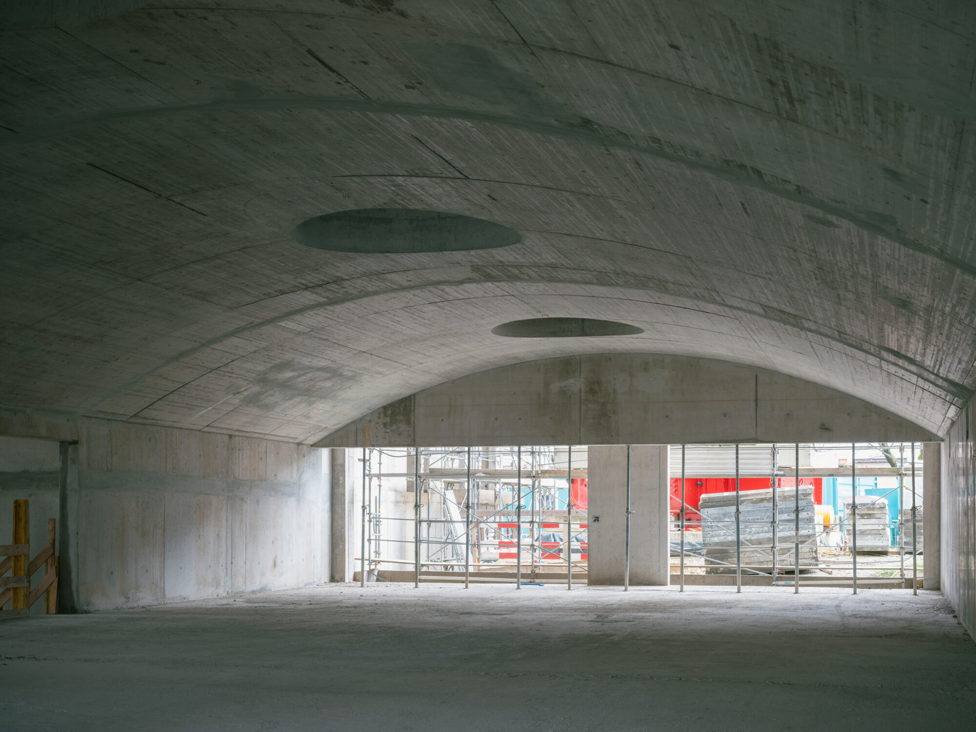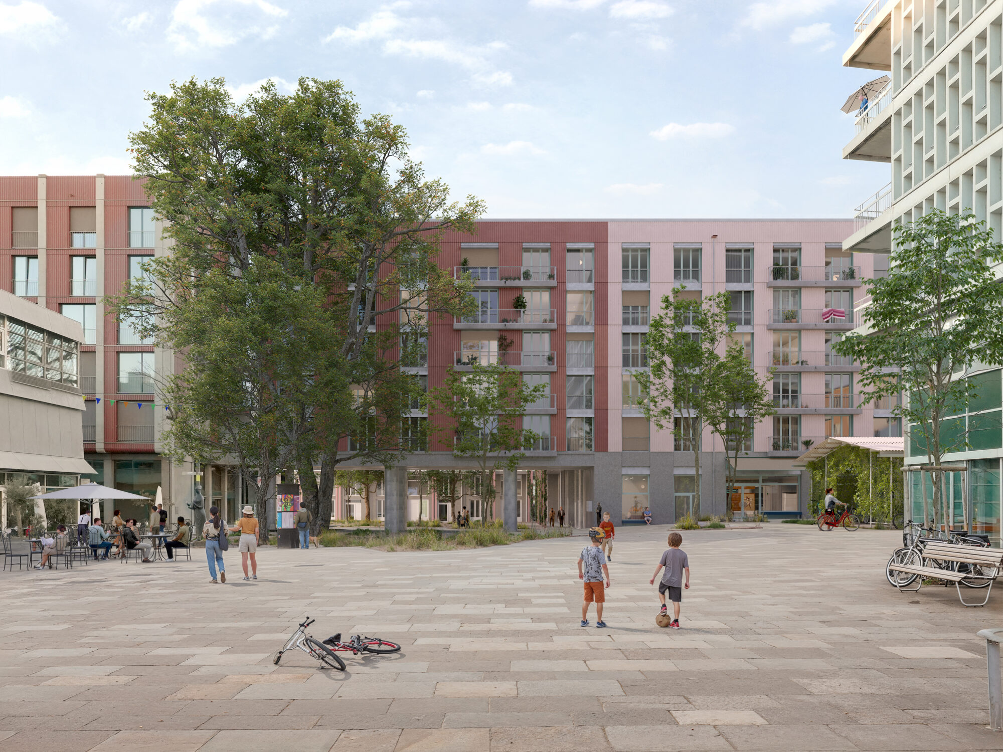 Die Laubengänge sind grosszügig bemessen, und bilden mit Sitzbänken ausgestattete Vorbereiche der jeweiligen Wohnungen aus. Auch in einer Geschosswohnung zu wohnen, kann sich so anfühlen als würde man ein eigenes Haus besitzen. Bereiche, die nicht als Fluchtweg dienen, werden auf dem Boden markiert und für private oder gemeinschaftliche Möblierung genutzt. Zum Grüngürtel hin befinden sich grössere Flächen, die für spontane nachbarschaftliche Zusammenkünfte genutzt werden können und die Gemeinschaft fördern.